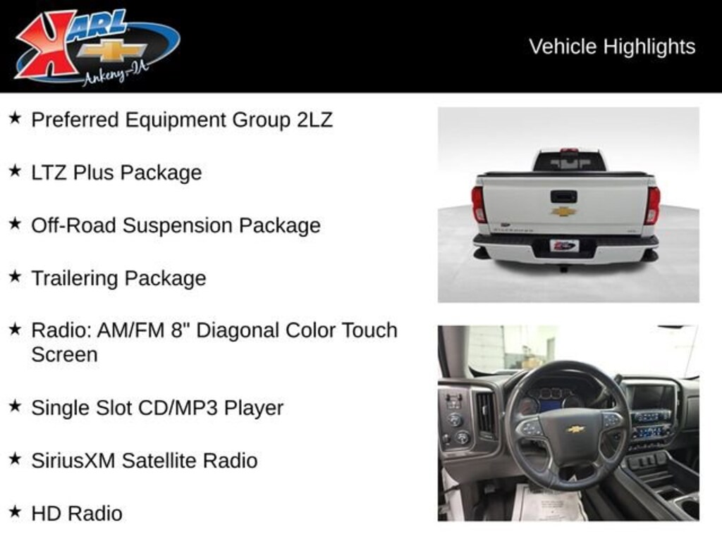 Recent Arrival! CARFAX One Owner, Local Trade & Sold New at Karls! Certified. Summit White 2017 Chevrolet Silverado 1500 LTZ 4WD CREW CAB 143.5 EcoTec3 5.3L V8 8-Speed Automatic with Overdrive, 4WD, Jet Black Leather, 110-Volt AC Power Outlet, 150 Amp Alternator, 4.2 Diagonal Color Display Driver Info Center, 6 Speaker Audio System, Auto-Dimming Inside Rear-View Mirror, Auxiliary External Transmission Oil Cooler, Bluetooth® For Phone, Body Color Rear Bumper w/Cornersteps, Body-Color Grille Surround, Body-Color Headlamp Bezels, Bose Speaker System, Chrome Bodyside Moldings, Chrome Cap Power-Adjustable Heated Outside Mirrors, Chrome Door Handles, Chrome Mirror Caps, Color-Keyed Carpeting w/Rubberized Vinyl Floor Mats, Deep-Tinted Glass, Driver & Front Passenger Illuminated Vanity Mirrors, Dual-Zone Automatic Climate Control, Electric Rear-Window Defogger, Exterior Parking Camera Rear, EZ Lift & Lower Tailgate, Floor Mounted Console, Front Body-Color Bumper, Front Chrome Bumper, Front Frame-Mounted Black Recovery Hooks, Front Full Feature Power Reclining Bucket Seats, HD Radio, Heated & Vented Front Seating, Heavy-Duty Rear Locking Differential, Hill Descent Control, Integrated Trailer Brake Controller, Leather Wrapped Heated Steering Wheel w/Cruise Controls, LED Taillamps w/Signature, LTZ Plus Package, Manual Tilt/Telescoping Steering Column, Memory seat, Off-Road Suspension Package, OnStar 3 Months Guidance Plan, OnStar w/4G LTE, Power Adjustable Pedals, Power driver seat, Power Sliding Rear Window, Power Sunroof, Power Windows w/Driver Express Up, Preferred Equipment Group 2LZ, Radio: AM/FM 8 Diagonal Color Touch Screen, Rear 60/40 Folding Bench Seat (Folds Up), Rear Chrome Bumper, Rear Vision Camera, Rear Wheelhouse Liners, Remote Keyless Entry, Remote Locking Tailgate, Remote Vehicle Starter System, Single Slot CD/MP3 Player, SiriusXM Satellite Radio, Spray-On Pickup Box Bed Liner, Steering Wheel Audio Controls, Theft Deterrent System (Unauthorized Entry), Thin Profile LED Fog Lamps, Trailering Package, Ultrasonic Front & Rear Park Assist, Universal Home Remote, Wireless Charging. 15/20 City/Highway MPG 8-Speed Automatic with Overdrive 4WD