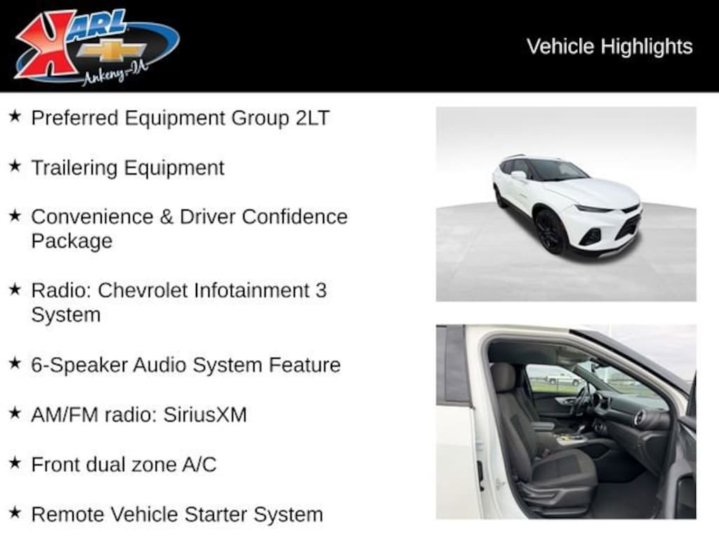 At Karl Chevrolet we want to help you find the best new or used car in Ankeny that suits your needs. Check out the 2019 Chevrolet Blazer For Sale in Ankeny, IA. When you buy a new car at Karl Chevrolet you know you're finding a vehicle you can rely on. We have a great selection of Platinum Quality Pre-Owned Vehicles. We also pride ourselves in creating a friendly atmosphere and reliable new car dealership that you can trust. Call us with any questions about our 2019 Chevrolet Blazer and our experts will be glad to help you! (515) 299-4300. *Equipment and options are generated by a 3rd party vendor, exact vehicle options may vary. Please see a salesperson for complete details and vehicle information.