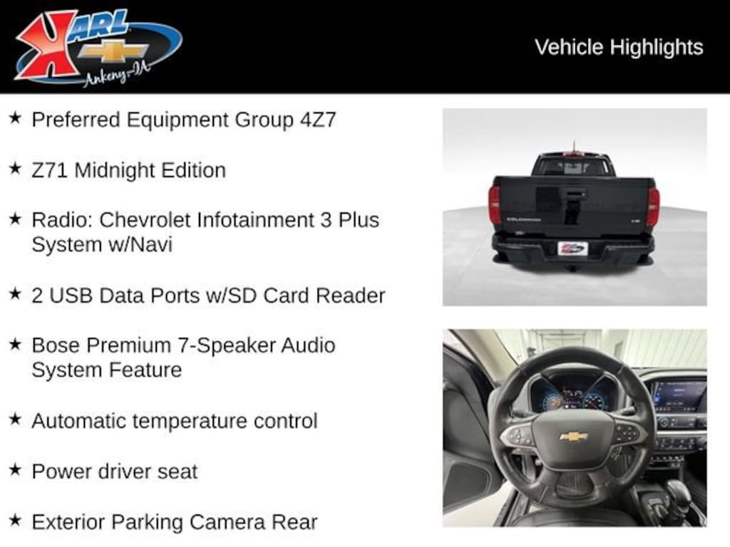 At Karl Chevrolet we want to help you find the best new or used car in Ankeny that suits your needs. Check out the 2022 Chevrolet Colorado For Sale in Ankeny, IA. When you buy a new car at Karl Chevrolet you know you're finding a vehicle you can rely on. We have a great selection of Platinum Quality Pre-Owned Vehicles. We also pride ourselves in creating a friendly atmosphere and reliable new car dealership that you can trust. Call us with any questions about our 2022 Chevrolet Colorado and our experts will be glad to help you! (515) 299-4300. *Equipment and options are generated by a 3rd party vendor, exact vehicle options may vary. Please see a salesperson for complete details and vehicle information.