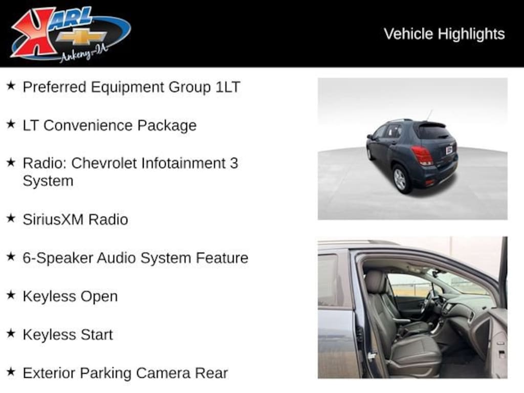 At Karl Chevrolet, we want to help you find the best new or used car in Ankeny that suits your needs. When you buy a new car at Karl Chevrolet, you know you're finding a vehicle you can rely on. We have a great selection of Platinum Quality Pre-Owned Vehicles. We also pride ourselves in creating a friendly atmosphere and a reliable Dealership that you can trust. Call us and our experts will be glad to help you! (515) 299-4300. *Equipment and options are generated by a 3rd party vendor, exact vehicle options may vary. Please see a salesperson for complete details and vehicle information.