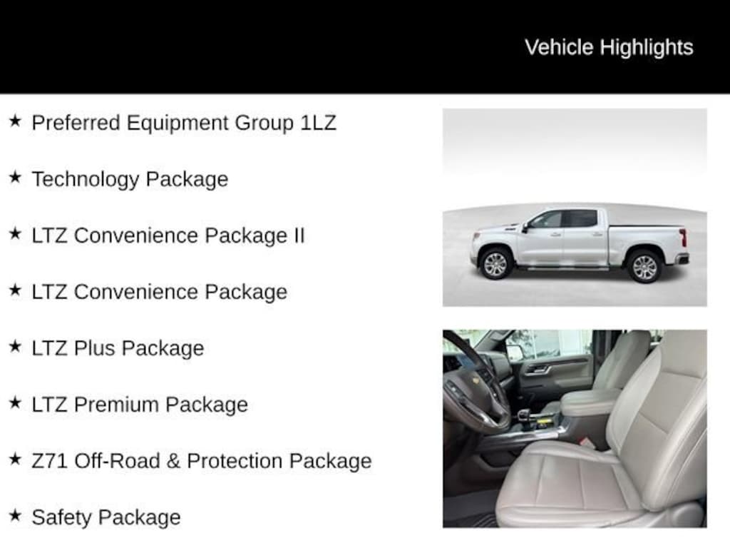 10-Way Power Driver Seat w/Lumbar, 10-Way Power Passenger Seat Adjuster w/Lumbar, 12.3 Multicolor Reconfigurable Digital Display, 120-Volt Bed Mounted Power Outlet, 120-Volt Instrument Panel Power Outlet, 15 Diagonal Multicolor Head-Up Display, 2 USB Data Ports, 2nd Row Heated Outboard Seats, Adaptive Cruise Control, All-Weather Floor Liner (LPO) (AAK), Auto-Dimming Inside Rear-View Mirror, Auto-Locking Rear Differential, Bed View Camera, Bluetooth® For Phone, Chevrolet Connected Access Capable, Chevytec Spray-On Black Bedliner, Chrome Mirror Caps, Color-Keyed Carpeting Floor Covering, Compass, Deep-Tinted Glass, Driver Memory, Dual Exhaust w/Polished Outlets, Dual Rear USB Ports (Charge Only), Electric Rear-Window Defogger, Electrical Steering Column Lock, Electronic Cruise Control, Floor Mounted Center Console, Front Frame-Mounted Black Recovery Hooks, Front LED Fog Lamps, Front Rainsensing Wipers, Front Rubberized Vinyl Floor Mats, HD Surround Vision, Heated Driver & Front Outboard Passenger Seats, Heated Steering Wheel, Heavy-Duty Air Filter, High Capacity Suspension Package, Hill Descent Control, Hitch Guidance, Hitch Guidance w/Hitch View, Integrated Trailer Brake Controller, Keyless Open & Start, LED Cargo Area Lighting, LTZ Convenience Package, LTZ Convenience Package II, LTZ Plus Package, LTZ Premium Package, Off-Road Suspension, OnStar & Chevrolet Connected Services Capable, Outside Heated Power-Adjustable Mirrors, Perimeter Lighting, Power Front Passenger Windows w/Express Up/Down, Power Front Windows w/Driver Express Up/Down, Power Rear Windows w/Express Down, Power Sliding Rear Window w/Rear Defogger, Power Sunroof, Power Tailgate, Power Tilt & Telescoping Steering Column, Preferred Equipment Group 1LZ, Premium Bose 7-Speaker Sound System, Rear Camera Mirror, Rear Cross Traffic Alert-Braking, Rear Pedestrian Alert, Rear Rubberized-Vinyl Floor Mats, Rear Wheelhouse Liners, Remote Vehicle Starter System, Safety Alert Seat, Safety Package, SiriusXM w/360L, Standard Tailgate, Steering Wheel Audio Controls, Technology Package, Theft Deterrent System (Unauthorized Entry), Trailer Camera Provisions, Trailer Side Blind Zone Alert, Trailering App, Trailering Package, Ultrasonic Front & Rear Park Assist, Universal Home Remote, Up-Level Rear Seat w/Storage Package, Ventilated Driver & Front Passenger Seats, Wi-Fi Hot Spot Capable, Wireless Charging, Wireless Phone Projection, Wrapped Steering Wheel, Z71 Off-Road & Protection Package, Z71 Off-Road Package.