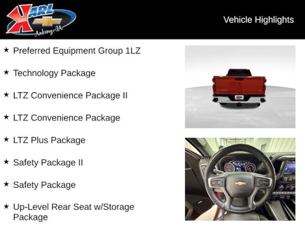 At Karl Chevrolet we want to help you find the best new or used car in Ankeny that suits your needs. When you buy a new car at Karl Chevrolet you know you're finding a vehicle you can rely on. We have a great selection of Platinum Quality Pre-Owned Vehicles. We also pride ourselves in creating a friendly atmosphere and a reliable Dealership that you can trust. Call us and our experts will be glad to help you! (515) 299-4300. *Equipment and options are generated by a 3rd party vendor, exact vehicle options may vary. Please see a salesperson for complete details and vehicle information.