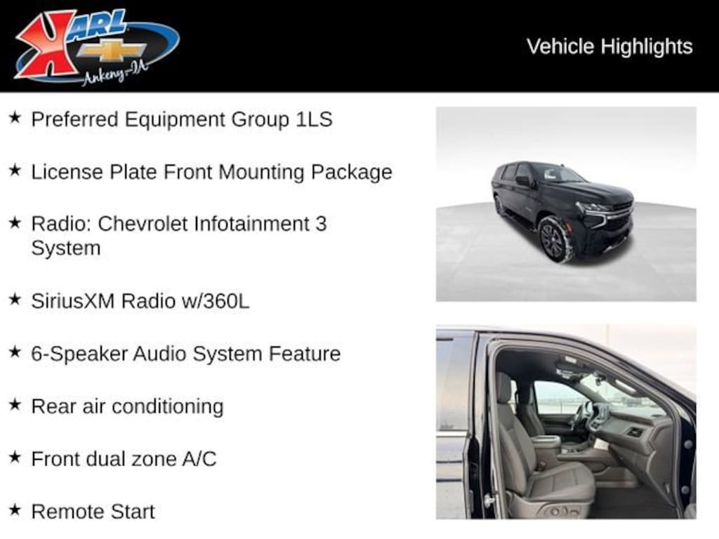 At Karl Chevrolet we want to help you find the best new or used car in Ankeny that suits your needs. Check out the 2023 Chevrolet Tahoe For Sale in Ankeny, IA. When you buy a new car at Karl Chevrolet you know you're finding a vehicle you can rely on. We have a great selection of Platinum Quality Pre-Owned Vehicles. We also pride ourselves in creating a friendly atmosphere and reliable new car dealership that you can trust. Call us with any questions about our 2023 Chevrolet Tahoe and our experts will be glad to help you! (515) 299-4300. *Equipment and options are generated by a 3rd party vendor, exact vehicle options may vary. Please see a salesperson for complete details and vehicle information.
