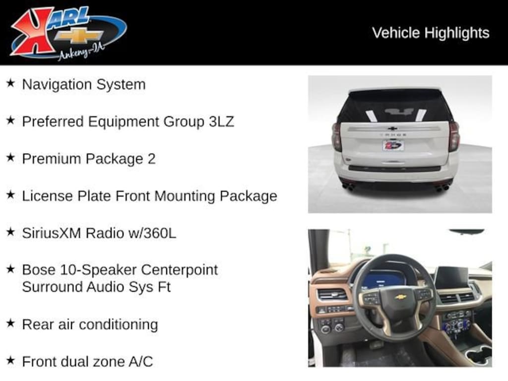At Karl Chevrolet we want to help you find the best new or used car in Ankeny that suits your needs. Check out the 2023 Chevrolet Tahoe For Sale in Ankeny, IA. When you buy a new car at Karl Chevrolet you know you're finding a vehicle you can rely on. We have a great selection of Platinum Quality Pre-Owned Vehicles. We also pride ourselves in creating a friendly atmosphere and reliable new car dealership that you can trust. Call us with any questions about our 2023 Chevrolet Tahoe and our experts will be glad to help you! (515) 299-4300. *Equipment and options are generated by a 3rd party vendor, exact vehicle options may vary. Please see a salesperson for complete details and vehicle information.