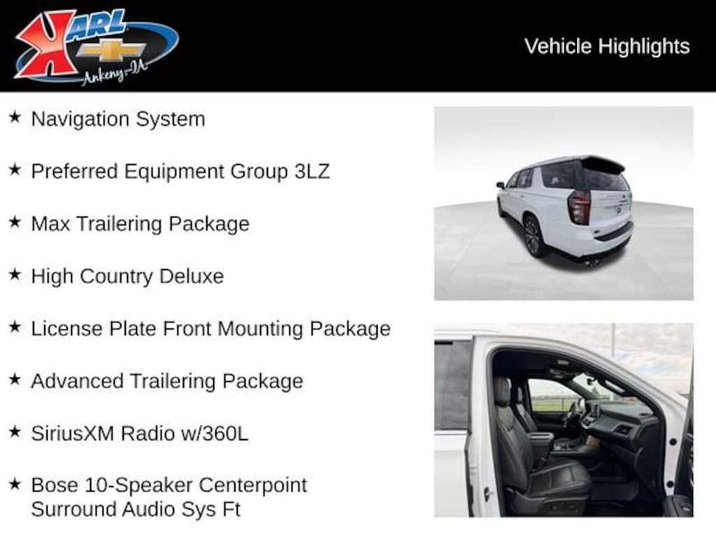 Recent Arrival! Sold New at Karls! Equipped With Power Running Boards! Certified. Summit White 2023 Chevrolet Tahoe High Country 4WD 4DR HIGH COUNTRY EcoTec3 6.2L V8 4WD, Jet Black Leather, 15 Diagonal Multi-Color Head-Up Display, 1st & 2nd Row Color-Keyed Carpeted Floor Mats, 2-Speed Active Electronic AutoTrac Transfer Case, 3rd Row 60/40 Power-Folding Split-Bench Seat, Advanced Trailering Package, Air Ride Adaptive Suspension, Apple CarPlay/Android Auto, Auto High-beam Headlights, Black Name Plates (LPO), Bose 10-Speaker Centerpoint Surround Audio Sys Ft, Bright Front & Rear Door Sill Plates, Chrome Door Handles w/Body-Color Strip, Color-Keyed Carpeting Floor Covering, Driver & Front Outboard Passenger Airbags, Dual Exhaust System, Dual-Pane Power Panoramic Sunroof, Enhanced Automatic Emergency Braking, Enhanced Driver Information Center, Exterior Parking Camera Rear, Extra Capacity Cooling System, Floor Console, Front dual zone A/C, Hands-Free Rear Power Programmable Liftgate, HD Surround Vision, Heads-Up Display, Heated & Ventilated Driver & Front Passenger Seats, Heated 2nd Row Outboard Seats, Heated Steering Wheel, High Country Deluxe, Hill Descent Control, Hitch Guidance w/Hitch View, Infotainment Display, Inside Rearview Auto-Dimming Rear Camera Mirror, Integrated Trailer Brake Controller, Lane Change Alert w/Side Blind Zone Alert, LED Daytime Running Lamps, License Plate Front Mounting Package, Max Trailering Package, Memory Settings, Navigation System, Outside Heated Power-Adjustable Mirrors, Power driver seat, Power Release 2nd Row Bucket Seats, Power Tilt & Telescopic Steering Column, Power-Retractable Assist Steps, Preferred Equipment Group 3LZ, Rain sensing wipers, Rear air conditioning, Rear Camera Mirror Washer, Rear Cross Traffic Alert, Rear Pedestrian Alert, Remote Start, Safety Alert Seat, SiriusXM Radio w/360L, Smart Trailer Integration Indicator, Trailer Side Blind Zone Alert, Universal Home Remote, Wheels: 22 Multi-Spoke Gloss Black (LPO) (SRV), Wheels: 22 x 9 Steel Interim (LPO), Wireless Charging, Wrapped Steering Wheel. 14/18 City/Highway MPG 10-Speed Automatic with Overdrive 4WD