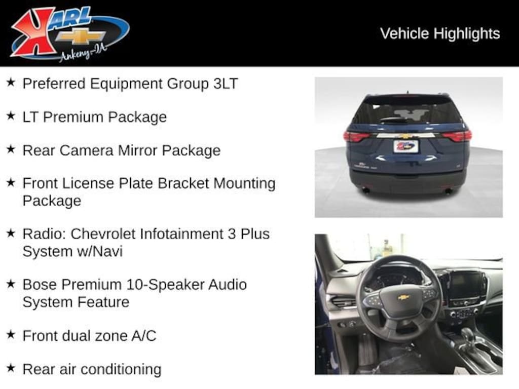 At Karl Chevrolet we want to help you find the best new or used car in Ankeny that suits your needs. Check out the 2023 Chevrolet Traverse For Sale in Ankeny, IA. When you buy a new car at Karl Chevrolet you know you're finding a vehicle you can rely on. We have a great selection of Platinum Quality Pre-Owned Vehicles. We also pride ourselves in creating a friendly atmosphere and reliable new car dealership that you can trust. Call us with any questions about our 2023 Chevrolet Traverse and our experts will be glad to help you! (515) 299-4300. *Equipment and options are generated by a 3rd party vendor, exact vehicle options may vary. Please see a salesperson for complete details and vehicle information.