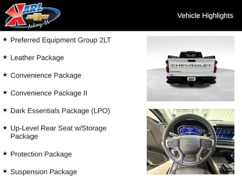 Certification Program Details: Karl Chevrolet of Ankeny, The Nation's #1 CarBravo certified dealer, where platinum quality vehicles and unmatched benefits come together! This vehicle qualifies for our CarBravo Certified program reserved for the highest-quality pre-owned vehicles that are 10 model years or newer and have less than 100,000 miles. Every CarBravo Certified vehicle includes: ? Comprehensive 126-Point Inspection Professionally inspected by factory-trained technicians to meet strict mechanical, safety, and cosmetic standards. ? 6-Month / 6,000-Mile Bumper-to-Bumper Limited Warranty Enjoy added peace of mind with extensive coverage from the day you drive off the lot. ? 24/7 Roadside Assistance & Courtesy Transportation Flat tire? Dead battery? Need a tow? You're covered anywhere, anytime throughout the warranty period. ? Vehicle History & Title Guarantee Clean title, completed safety recalls, and a full CARFAX® or AutoCheck® report provided for complete transparency. ? 10-Day / 500-Mile Exchange Promise If you don't absolutely love it, bring it back and exchange it no hassle, no stress. Experience peace of mind and premium protection exclusively from Karl Chevrolet of Ankeny, the Nation's #1 CarBravo Certified Deale