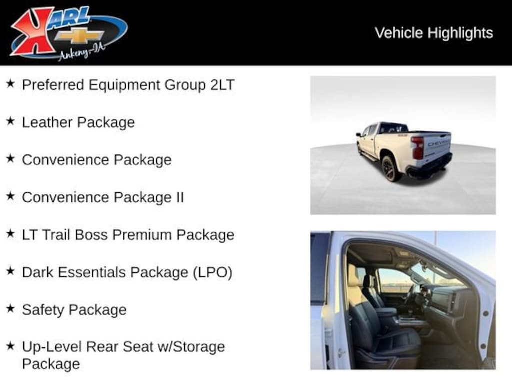 Certification Program Details: Karl Chevrolet of Ankeny, The Nation's #1 CarBravo Certified Dealer! Every CarBravo Certified vehicle includes: Comprehensive 126-Point Inspection Professionally inspected by factory-trained technicians to meet strict mechanical, safety, and cosmetic standards. 12-Month / 12,000-Mile Bumper-to-Bumper Limited Warranty Enjoy added peace of mind with extensive coverage from the day you drive off the lot. 24/7 Roadside Assistance & Courtesy Transportation Flat tire? Dead battery? Need a tow? You're covered anywhere, anytime throughout the warranty period. Vehicle History & Title Guarantee Clean title, completed safety recalls, and a full CARFAX® or AutoCheck® report provided for complete transparency. 10-Day / 500-Mile Exchange Promise If you don't absolutely love it, bring it back and exchange it no hassle, no stress. Experience peace of mind and premium protection exclusively from Karl Chevrolet of Ankeny, the Nation's #1 CarBravo Dealer!This 2024 Chevrolet Silverado 1500 LT Trail Boss 4WD Crew Cab 147 LT Trail Boss is a true workhorse with a rugged, adventurous spirit. Boasting a powerful 3.0L I6 Duramax Diesel engine, this truck delivers exceptional performance and towing capability. Outfitted with the LT Trail Boss Premium Package, it's equipped with a wealth of premium features that elevate both comfort and capability. LT Trail Boss Premium Package 3.0L I-6 Diesel Turbocharged (Duramax) Iridescent Pearl Tricoat Exterior Power Sunroof 20 High Gloss Black Painted Aluminum Wheels Leather-Appointed Front Seat Trim Heated Front Seats Heated Steering Wheel Bose Premium Audio SystemThis Silverado 1500 LT Trail Boss is more than just a capable truck it's a versatile companion that can handle any task or adventure with ease. Whether you're towing a trailer, navigating off-road terrain, or simply commuting in style, this truck is up for the challenge.Certified through Karl Chevrolet's CarBravo program, this Silverado 1500 LT Trail Boss has undergone a comprehensive 126-point inspection and comes with a 12-month/12,000-mile bumper-to-bumper limited warranty, 24/7 roadside assistance, and a vehicle history and title guarantee. You can purchase this vehicle with confidence, knowing that it meets the highest standards of quality and reliability.At Karl Chevrolet, we're dedicated to providing our customers with an exceptional buying experience. Our team of experts is here to help you find the perfect vehicle that fits your needs and lifestyle. We invite you to come in and test drive this impressive 2024 Chevrolet Silverado 1500 LT Trail Boss 4WD Crew Cab 147 LT Trail Boss. Experience the power, capability, and premium features that make this truck a true standout in its class.At Karl Chevrolet we want to help you find the best new or used car in Ankeny that suits your needs. When you buy a new car at Karl Chevrolet you know you're finding a vehicle you can rely on. We have a great selection of Platinum Quality Pre-Owned Vehicles. We also pride ourselves in creating a friendly atmosphere and a reliable Dealership that you can trust. Call us and our experts will be glad to help you! (515) 299-4300. *Equipment and options are generated by a 3rd party vendor, exact vehicle options may vary. Please see a salesperson for complete details and vehicle information.
