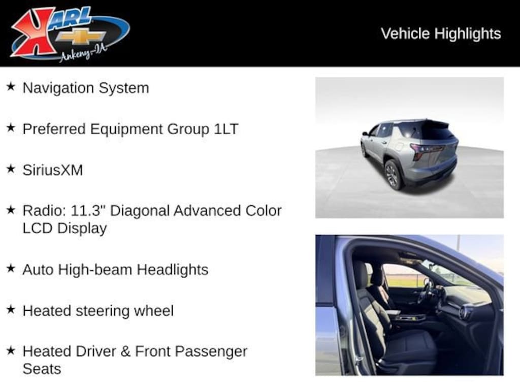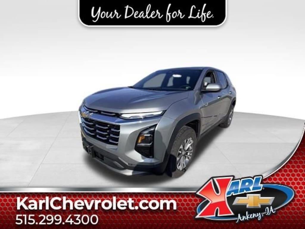 Certification Program Details: Karl Chevrolet of Ankeny, The Nation's #1 CarBravo Certified Dealer! Every CarBravo Certified vehicle includes: Comprehensive 126-Point Inspection Professionally inspected by factory-trained technicians to meet strict mechanical, safety, and cosmetic standards. 12-Month / 12,000-Mile Bumper-to-Bumper Limited Warranty Enjoy added peace of mind with extensive coverage from the day you drive off the lot. 24/7 Roadside Assistance & Courtesy Transportation Flat tire? Dead battery? Need a tow? You're covered anywhere, anytime throughout the warranty period. Vehicle History & Title Guarantee Clean title, completed safety recalls, and a full CARFAX® or AutoCheck® report provided for complete transparency. 10-Day / 500-Mile Exchange Promise If you don't absolutely love it, bring it back and exchange it no hassle, no stress. Experience peace of mind and premium protection exclusively from Karl Chevrolet of Ankeny, the Nation's #1 CarBravo Dealer!- Radio: 11.3 Diagonal Advanced Color LCD Display- SiriusXM- Auto High-beam Headlights- Heated steering wheel- Navigation System- Heated Driver & Front Passenger Seats- Preferred Equipment Group 1LTThis 2025 Chevrolet Equinox LT FWD 4DR LT W/1LT is a standout in its class, offering a winning combination of style, technology, and performance. With its sleek Gray exterior and well-appointed interior, this Equinox is sure to turn heads wherever you go.Under the hood, you'll find a 1.5L DOHC engine paired with a smooth-shifting CVT transmission, delivering an impressive 26 city / 28 highway MPG. Whether you're commuting to the office or embarking on a weekend adventure, this Equinox will get you there efficiently and confidently.Step inside and you'll be greeted by a host of premium features, including the advanced 11.3 Diagonal Color LCD Display, SiriusXM radio, and a state-of-the-art navigation system. Stay connected and entertained on the go, while the heated steering wheel and seats keep you cozy in any weather.Safety is also a top priority, with features like Auto High-beam Headlights, Electronic Stability Control, and a comprehensive suite of airbags to give you peace of mind behind the wheel.This Equinox has been meticulously inspected and certified through our exclusive CarBravo program, ensuring you get a vehicle you can trust. With a 126-point inspection, a 12-month/12,000-mile bumper-to-bumper warranty, and 24/7 roadside assistance, you can drive with confidence knowing your investment is protected.At Karl Chevrolet, we're committed to providing our customers with an exceptional car-buying experience. Our team of experts is standing by to answer any questions you may have and help you find the perfect vehicle to fit your lifestyle. Don't wait - schedule a test drive today and discover the difference a certified Equinox can make.At Karl Chevrolet we want to help you find the best new or used car in Ankeny that suits your needs. When you buy a new car at Karl Chevrolet you know you're finding a vehicle you can rely on. We have a great selection of Platinum Quality Pre-Owned Vehicles. We also pride ourselves in creating a friendly atmosphere and a reliable Dealership that you can trust. Call us and our experts will be glad to help you! (515) 299-4300. *Equipment and options are generated by a 3rd party vendor, exact vehicle options may vary. Please see a salesperson for complete details and vehicle information.