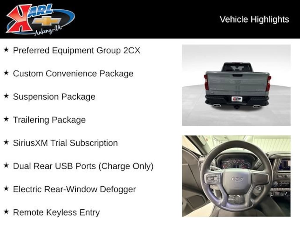 Recent Arrival! CARFAX One-Owner, Local Trade, Sold New at Karls & All Services Done at Karls! Equipped With Bed Liner! Clean CARFAX. Certified. Slate Gray Metallic 2025 Chevrolet Silverado 1500 Custom Trail Boss 4WD CREW CAB 147 CUSTOM TRAIL BOSS 3.0L I6 8-Speed Automatic, 4WD, Black Cloth, 3.5 Monochromatic Display Driver Info Center, Apple CarPlay/Android Auto, Auto High-beam Headlights, Auto-Locking Rear Differential, Bluetooth® For Phone, Color-Keyed Carpeting Floor Covering, Custom Convenience Package, Deep-Tinted Glass, Dual Exhaust w/Black Exhaust Tips, Dual Rear USB Ports (Charge Only), Electric Rear-Window Defogger, Electronic Cruise Control, EZ Lift Power Lock & Release Tailgate, Forward Collision Alert, Front Rubberized Vinyl Floor Mats, HD Rear Vision Camera, Heavy-Duty Air Filter, Hill Descent Control, Hitch Guidance, Lane Keep Assist w/Lane Departure Warning, LED Cargo Area Lighting, Manual Tilt Wheel Steering Column, OnStar Services Capable, Performance Red Recovery Hooks, Power driver seat, Power windows, Preferred Equipment Group 2CX, Rear 60/40 Folding Bench Seat (Folds Up), Rear Rubberized-Vinyl Floor Mats, Remote Keyless Entry, Remote Vehicle Starter System, SiriusXM Trial Subscription, Standard Tailgate, Suspension Package, Teen Driver, Theft Deterrent System (Unauthorized Entry), Tire Pressure Monitoring System, Trailering Package, Wheels: 18 x 8.5 Black Painted Aluminum, Wi-Fi Hot Spot Capable. 16/17 City/Highway MPG 8-Speed Automatic 4WDAt Karl Chevrolet we want to help you find the best new or used car in Ankeny that suits your needs. Check out the 2025 Chevrolet Silverado 1500 For Sale in Ankeny, IA. When you buy a new car at Karl Chevrolet you know you're finding a vehicle you can rely on. We have a great selection of Platinum Quality Pre-Owned Vehicles. We also pride ourselves in creating a friendly atmosphere and reliable new car dealership that you can trust. Call us with any questions about our 2025 Chevrolet Silverado 1500 and our experts will be glad to help you! (515) 299-4300. *Equipment and options are generated by a 3rd party vendor, exact vehicle options may vary. Please see a salesperson for complete details and vehicle information.Certification Program Details: Karl Chevrolet of Ankeny, The Nation's #1 CarBravo certified dealer, where platinum quality vehicles and unmatched benefits come together! This vehicle qualifies for our CarBravo Certified program reserved for the highest-quality pre-owned vehicles that are 10 model years or newer and have less than 100,000 miles. Every CarBravo Certified vehicle includes: ? Comprehensive 126-Point Inspection Professionally inspected by factory-trained technicians to meet strict mechanical, safety, and cosmetic standards. ? 6-Month / 6,000-Mile Bumper-to-Bumper Limited Warranty Enjoy added peace of mind with extensive coverage from the day you drive off the lot. ? 24/7 Roadside Assistance & Courtesy Transportation Flat tire? Dead battery? Need a tow? You're covered anywhere, anytime throughout the warranty period. ? Vehicle History & Title Guarantee Clean title, completed safety recalls, and a full CARFAX® or AutoCheck® report provided for complete transparency. ? 10-Day / 500-Mile Exchange Promise If you don't absolutely love it, bring it back and exchange it no hassle, no stress. Experience peace of mind and premium protection exclusively from Karl Chevrolet of Ankeny, the Nation's #1 CarBravo Certified Deale