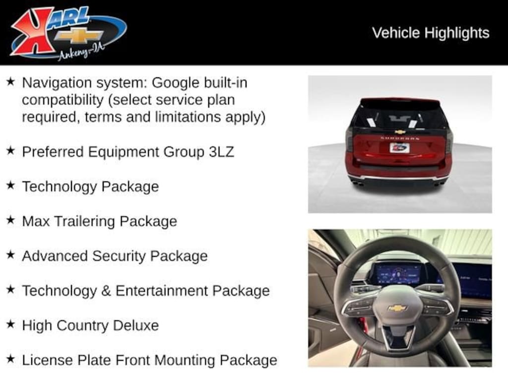 At Karl Chevrolet we want to help you find the best new or used car in Ankeny that suits your needs. When you buy a new car at Karl Chevrolet you know you're finding a vehicle you can rely on. We have a great selection of Platinum Quality Pre-Owned Vehicles. We also pride ourselves in creating a friendly atmosphere and a reliable Dealership that you can trust. Call us and our experts will be glad to help you! (515) 299-4300. *Equipment and options are generated by a 3rd party vendor, exact vehicle options may vary. Please see a salesperson for complete details and vehicle in