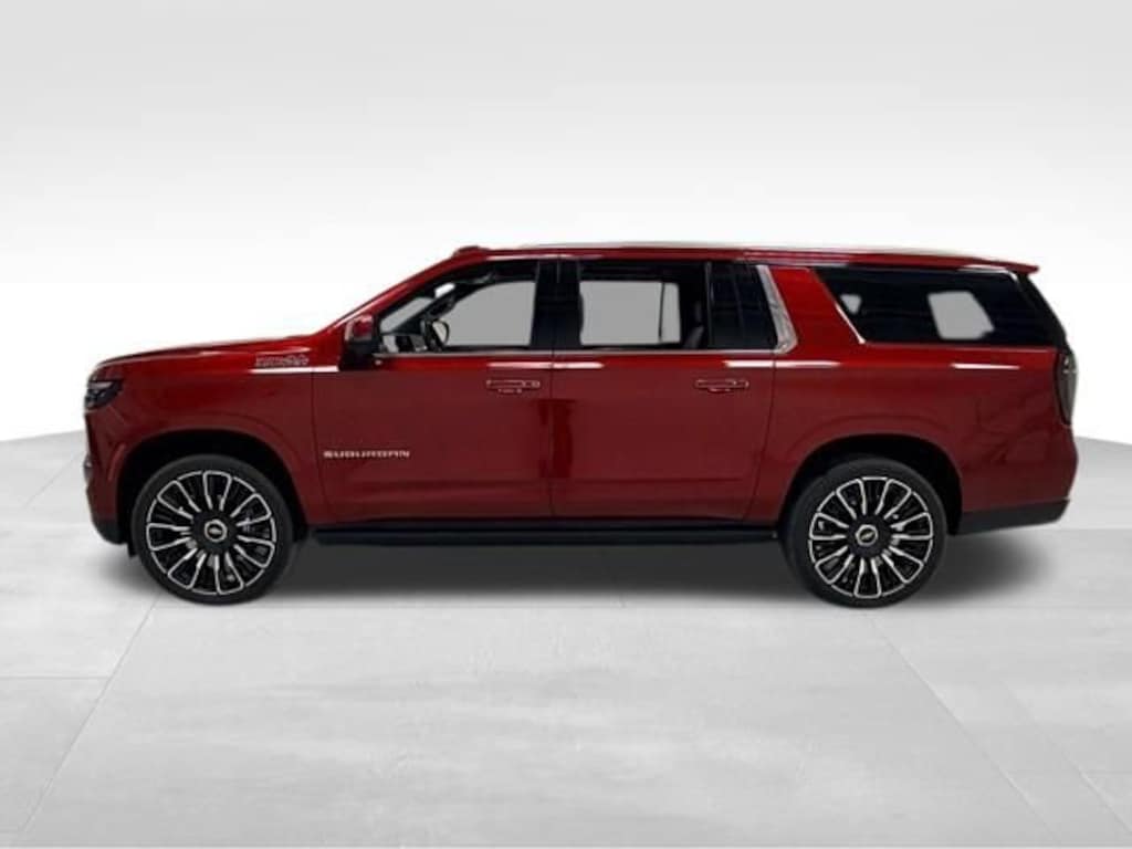 The exterior of this Suburban is dressed to impress in the striking Radiant Red Tintcoat color, complemented by the stunning 24 Bright Machined and Painted High Gloss Black wheels. The High Country Deluxe package adds premium features like the panoramic sunroof, power-retractable assist steps, and the advanced air ride suspension system.