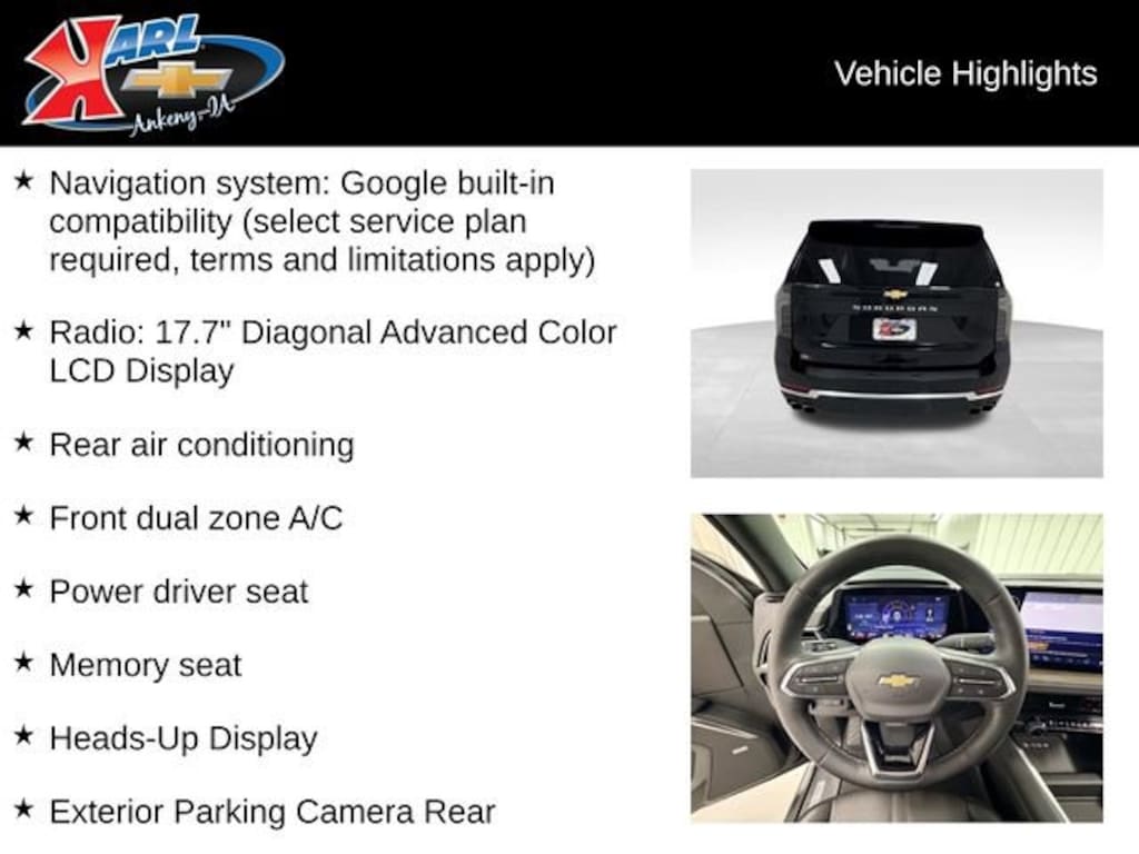 At Karl Chevrolet we want to help you find the best new or used car in Ankeny that suits your needs. Check out the 2025 Chevrolet Suburban For Sale in Ankeny, IA. When you buy a new car at Karl Chevrolet you know you're finding a vehicle you can rely on. We have a great selection of Platinum Quality Pre-Owned Vehicles. We also pride ourselves in creating a friendly atmosphere and reliable new car dealership that you can trust. Call us with any questions about our 2025 Chevrolet Suburban and our experts will be glad to help you! (515) 299-4300. *Equipment and options are generated by a 3rd party vendor, exact vehicle options may vary. Please see a salesperson for complete details and vehicle information.