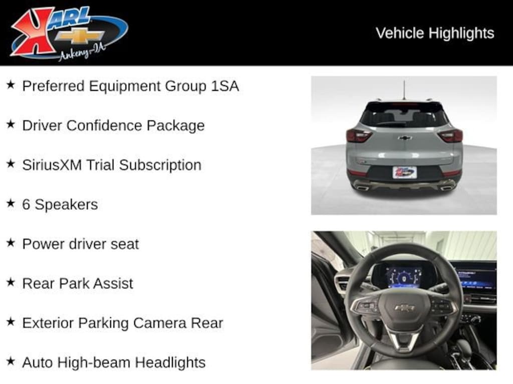 At Karl Chevrolet we want to help you find the best new or used car in Ankeny that suits your needs. Check out the 2025 Chevrolet TrailBlazer For Sale in Ankeny, IA. When you buy a new car at Karl Chevrolet you know you're finding a vehicle you can rely on. We have a great selection of Platinum Quality Pre-Owned Vehicles. We also pride ourselves in creating a friendly atmosphere and reliable new car dealership that you can trust. Call us with any questions about our 2025 Chevrolet TrailBlazer and our experts will be glad to help you! (515) 299-4300. *Equipment and options are generated by a 3rd party vendor, exact vehicle options may vary. Please see a salesperson for complete details and vehicle information.