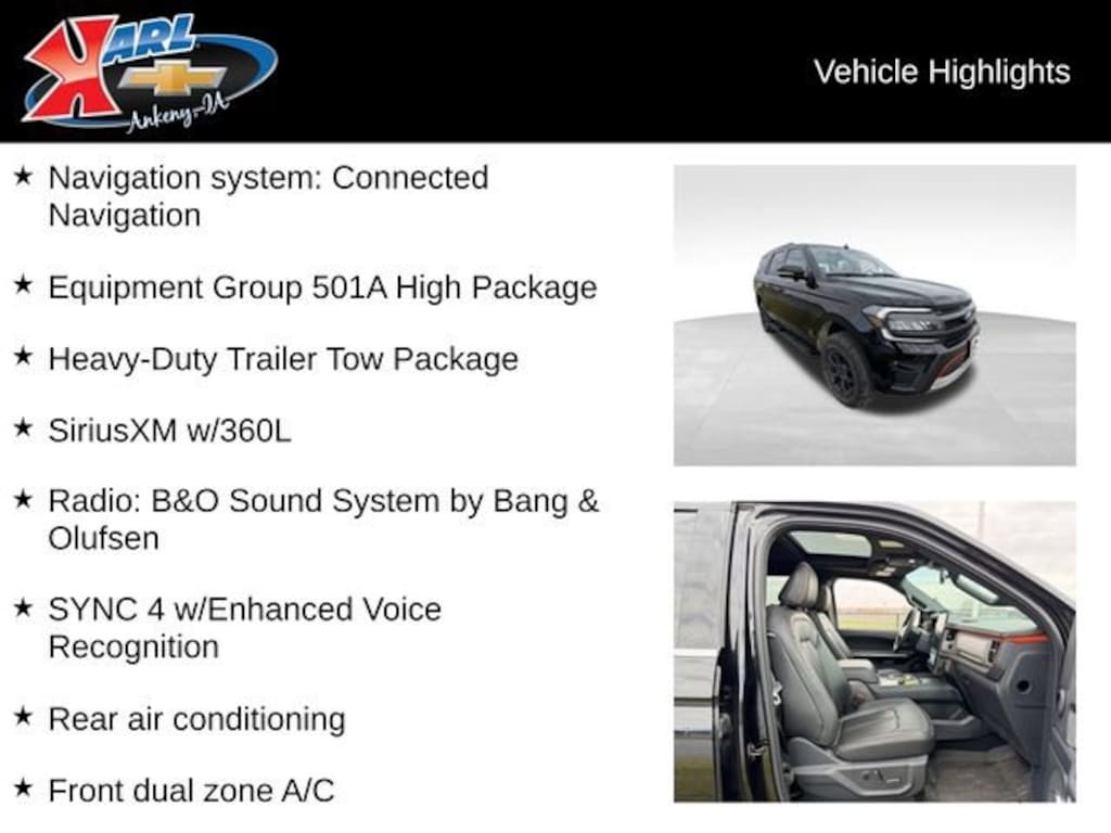 At Karl Chevrolet we want to help you find the best new or used car in Ankeny that suits your needs. Check out the 2024 Ford Expedition For Sale in Ankeny, IA. When you buy a new car at Karl Chevrolet you know you're finding a vehicle you can rely on. We have a great selection of Platinum Quality Pre-Owned Vehicles. We also pride ourselves in creating a friendly atmosphere and reliable new car dealership that you can trust. Call us with any questions about our 2024 Ford Expedition and our experts will be glad to help you! (515) 299-4300. *Equipment and options are generated by a 3rd party vendor, exact vehicle options may vary. Please see a salesperson for complete details and vehicle information.