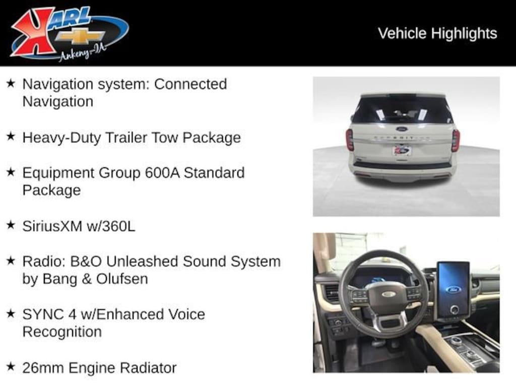 At Karl Chevrolet we want to help you find the best new or used car in Ankeny that suits your needs. Check out the 2024 Ford Expedition Max For Sale in Ankeny, IA. When you buy a new car at Karl Chevrolet you know you're finding a vehicle you can rely on. We have a great selection of Platinum Quality Pre-Owned Vehicles. We also pride ourselves in creating a friendly atmosphere and reliable new car dealership that you can trust. Call us with any questions about our 2024 Ford Expedition Max and our experts will be glad to help you! (515) 299-4300. *Equipment and options are generated by a 3rd party vendor, exact vehicle options may vary. Please see a salesperson for complete details and vehicle information.