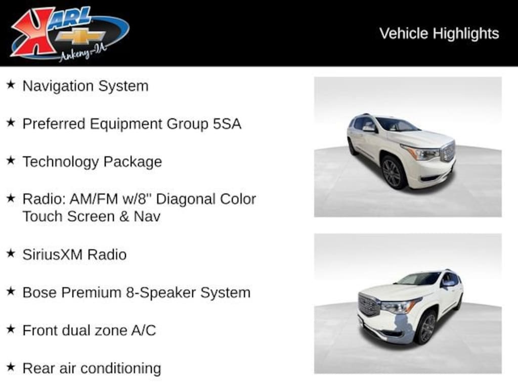 At Karl Chevrolet we want to help you find the best new or used car in Ankeny that suits your needs. Check out the 2019 GMC Acadia For Sale in Ankeny, IA. When you buy a new car at Karl Chevrolet you know you're finding a vehicle you can rely on. We have a great selection of Platinum Quality Pre-Owned Vehicles. We also pride ourselves in creating a friendly atmosphere and reliable new car dealership that you can trust. Call us with any questions about our 2019 GMC Acadia and our experts will be glad to help you! (515) 299-4300. *Equipment and options are generated by a 3rd party vendor, exact vehicle options may vary. Please see a salesperson for complete details and vehicle information.