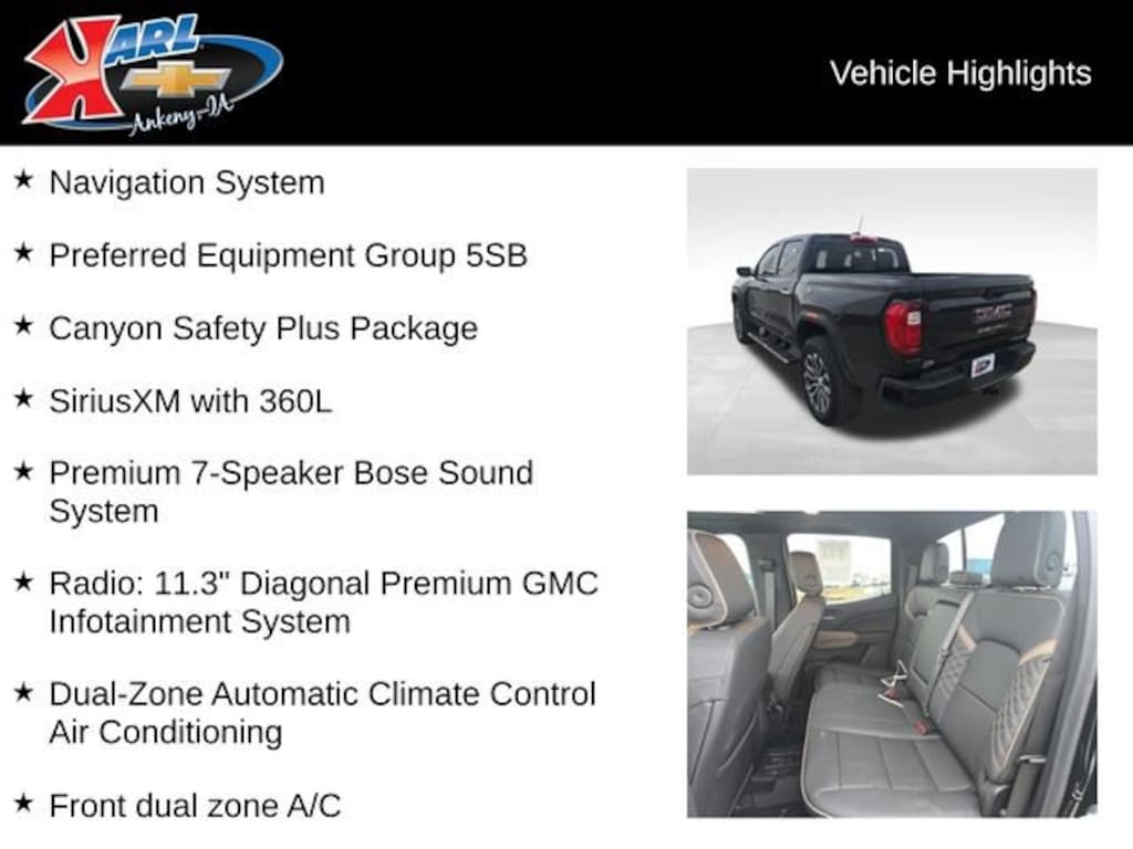 Beyond its impressive performance, this Canyon Denali is packed with premium features that elevate the driving experience. Enjoy the convenience of the 11.3 Diagonal Premium GMC Infotainment System, complete with built-in navigation, SiriusXM with 360L, and wireless Apple CarPlay/Android Auto. Stay comfortable with dual-zone automatic climate control, heated and ventilated front seats, and a heated steering wheel. And with the Canyon Safety Plus Package, you'll have access to advanced driver assistance technologies like Automatic Emergency Braking, Front Pedestrian and Bicyclist Braking, and Adaptive Cruise Control.