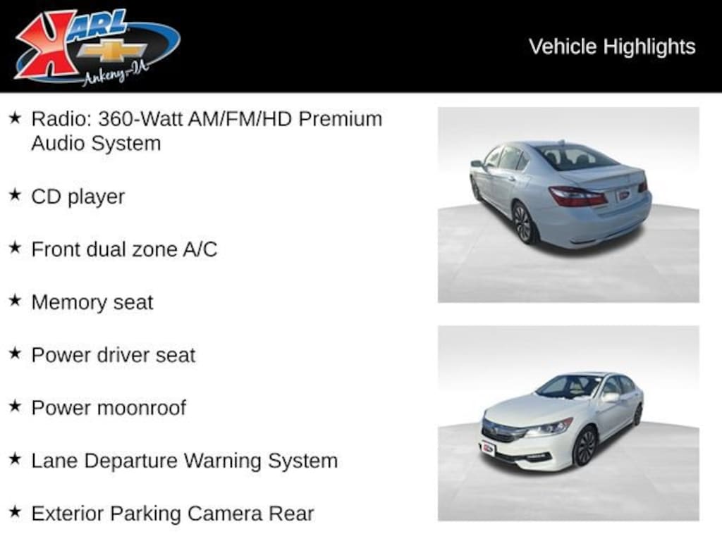 At Karl Chevrolet we want to help you find the best new or used car in Ankeny that suits your needs. Check out the 2017 Honda Accord Hybrid For Sale in Ankeny, IA. When you buy a new car at Karl Chevrolet you know you're finding a vehicle you can rely on. We have a great selection of Platinum Quality Pre-Owned Vehicles. We also pride ourselves in creating a friendly atmosphere and reliable new car dealership that you can trust. Call us with any questions about our 2017 Honda Accord Hybrid and our experts will be glad to help you! (515) 299-4300. *Equipment and options are generated by a 3rd party vendor, exact vehicle options may vary. Please see a salesperson for complete details and vehicle information.