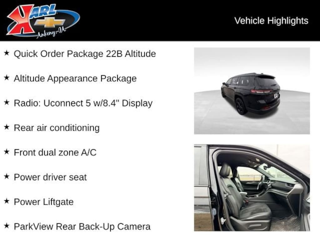 At Karl Chevrolet, we take pride in offering our customers the best new and used vehicles in Ankeny. Our team of experts is dedicated to helping you find the perfect car that suits your needs and budget. Call us today at (515) 299-4300 to schedule a test drive and experience the quality and reliability of this exceptional Jeep Grand Cherokee L Altitude.