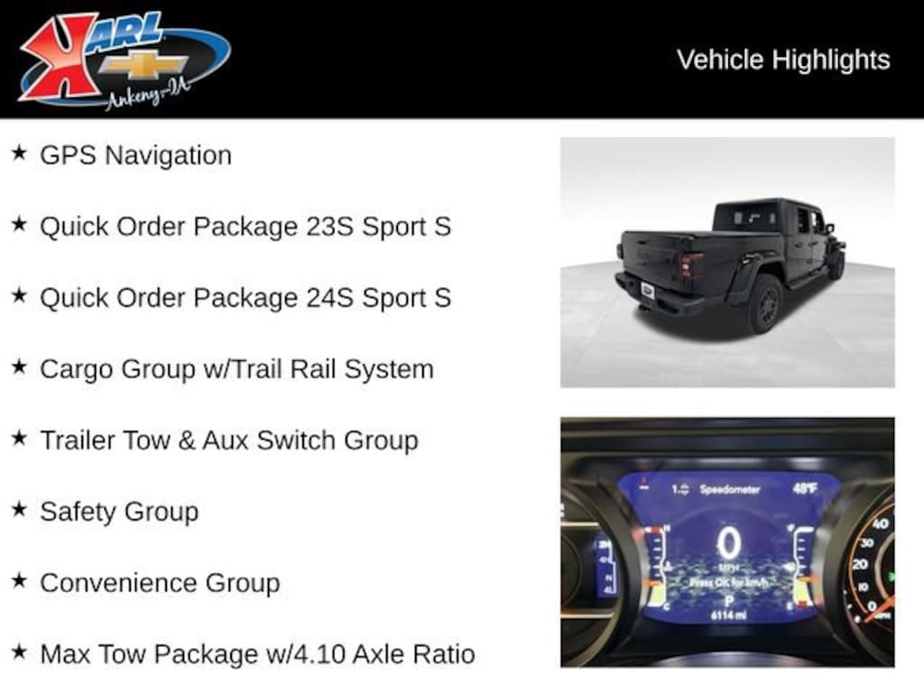 Recent Arrival! CARFAX One Owner, Local Trade & Sold New at Karls! Clean CARFAX. Certified. Black Clearcoat 2024 Jeep Gladiator Sport 4DR 4WD 3.6L V6 24V VVT 110 MPH Vehicle Max Speed Calibration, 115V Auxiliary Power Outlet, 12.3 Touchscreen Display, 4.10 Rear Axle Ratio, 4G LTE Wi-Fi Hot Spot, Advanced Brake Assist, Air Conditioning w/Auto Temperature Control, Alexa Built-In, Alpine Premium Audio System, Anti-Spin Differential Rear Axle, Apple CarPlay/Android Auto, Auto High Beam Headlamp Control, Auto-Dimming Rear-View Mirror, Automatic Headlamps, Auxiliary Switches, Black 3-Piece Hard Top, Black Molded-In-Color Fender Flares (2-Piece), Blind Spot & Cross Path Detection, Bluetooth Wireless Speaker, Body Color Fender Flares (2-Piece), Cargo Group w/Trail Rail System, Class IV Receiver Hitch, Cluster 7.0 TFT Color Display, Connected Travel & Traffic Services, Connectivity - US/Canada, Convenience Group, Conventional Differential Front Axle, Corning Gorilla Glass, Dana M210 Wide Front Axle, Dana M220 Wide Rear Axle, Daytime Running Lamp System, Deep Tint Sunscreen Windows, Disassociated Touchscreen Display, Emergency Vehicle Alert System (EVAS), Emergency/Assistance Call, Enhanced Adaptive Cruise Control, Exterior 115V AC Outlet, Exterior 230V AC Outlet, Freedom Panel Storage Bag, Front 1-Touch Down Power Windows, Front Door Locks 2-Door Passive Entry, Full Speed Forward Collision Warning Plus, Google Android Auto, GPS Antenna Input, GPS Navigation, HD Radio, Heated Front Seats, Heated Steering Wheel, Integrated Center Stack Radio, Integrated Voice Command w/Bluetooth, LED Taillamps, Lockable Rear Underseat Storage, Max Tow Package w/4.10 Axle Ratio, Media Hub w/2 Charge Only USBs, MOPAR Hardtop Headliner, MOPAR Spray In Bedliner, Normal Duty Plus Suspension, ParkSense Rear Park Assist System, ParkView Rear Back-Up Camera, Power Heated Mirrors, Power Tailgate Lock, Premium Wrapped Steering Wheel, Quick Order Package 23S Sport S, Quick Order Package 24S Sport S, Radio: Uconnect 5 Nav w/12.3 Display, Rear Sliding Window, Rear Window Defroster, Remote Keyless Entry, Remote Start System, Roll-Up Tonneau Cover, Safety Group, Security Alarm, SiriusXM Radio Service, SiriusXM w/360L, Speed Sensitive Power Locks, Sun Visors w/Illuminated Vanity Mirrors, Technology Group, Trail Rails, Trailer Hitch Zoom, Trailer Tow & Aux Switch Group, Universal Garage Door Opener, USB Host Flip, Wheels: 17 x 7.5 Gray. 17/22 City/Highway MPG 8-Speed Automatic 4WD