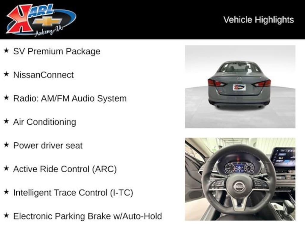 At Karl Chevrolet we want to help you find the best new or used car in Ankeny that suits your needs. Check out the 2023 Nissan Altima For Sale in Ankeny, IA. When you buy a new car at Karl Chevrolet you know you're finding a vehicle you can rely on. We have a great selection of Platinum Quality Pre-Owned Vehicles. We also pride ourselves in creating a friendly atmosphere and reliable new car dealership that you can trust. Call us with any questions about our 2023 Nissan Altima and our experts will be glad to help you! (515) 299-4300. *Equipment and options are generated by a 3rd party vendor, exact vehicle options may vary. Please see a salesperson for complete details and vehicle information.