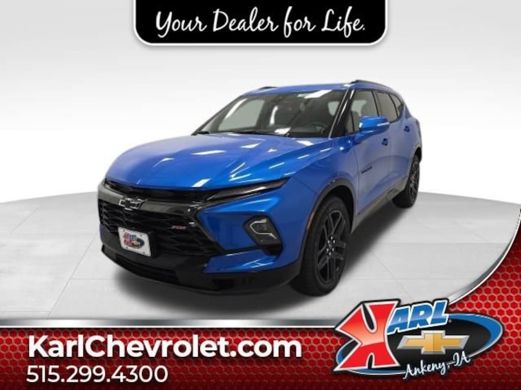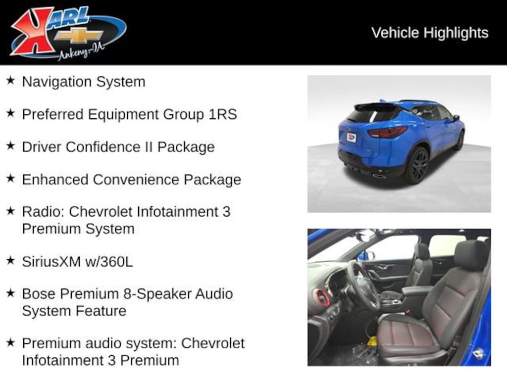 Factory MSRP: $52,315 $2,792 off MSRP! 18/26 City/Highway MPG AWD, Adaptive Cruise Control, Apple CarPlay/Android Auto, Bose Premium 8-Speaker Audio System Feature, Driver Confidence II Package, Enhanced Automatic Emergency Braking, Enhanced Convenience Package, Front Bucket Seats, Front Center Armrest, HD Surround Vision, Heated Driver & Front Passenger Seats, Heated Rear Outboard Seating Positions, Memory Settings For Driver Seat & Exterior Mirrors, Navigation System, Perforated Leather-Appointed Seat Trim, Power Driver Lumbar Control, Power Liftgate, Power Panoramic Tilt-Sliding Sunroof, Power passenger seat, Power Tilt & Telescoping Steering Column, Preferred Equipment Group 1RS, Premium audio system: Chevrolet Infotainment 3 Premium, Radio: Chevrolet Infotainment 3 Premium System, Rear Camera Mirror, Rear Camera Mirror Washer, Safety Alert Seat, SiriusXM w/360L, Split folding rear seat, Ventilated Driver & Front Passenger Seats, Wheels: 20 Gloss Black Aluminum.Blue 2025 Chevrolet Blazer RS 4D Sport Utility 3.6L V6 SIDI 9-Speed Automatic with Overdrive AWD Price includes: $1000 - Chevrolet Consumer Cash Program. Exp. 12/01/2025 $750 BLACK FRIDAY SPECIAL EXPIRES 11/29
