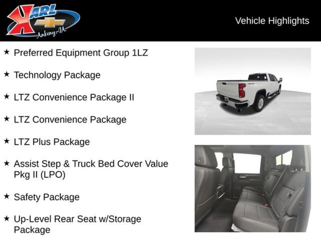 Factory MSRP: $82,824 $7,548 off MSRP! 10-Speed Automatic, 4WD, Black Leather, 10-Way Power Driver Seat Adjuster w/Lumbar, 10-Way Power Passenger Seat Adjuster w/Lumbar, 120-Volt Bed Mounted Power Outlet, 120-Volt Interior Power Outlet, 15 Diagonal Multicolor Head-Up Display, 170 Amp Alternator, 2 Charge/Data USB Ports Inside Center Console, 220 Amp Alternator, 4 Round Chromed Assist Steps (LPO), 6-Speaker Audio System, Adaptive Cruise Control, Apple CarPlay/Android Auto, Assist Step & Truck Bed Cover Value Pkg II (LPO), Auto-Dimming Inside Rear-View Mirror, Bed View Camera w/2 Trailer Camera Provisions, Black Chevytec Spray-On Bedliner, Bluetooth® For Phone, BOSE Premium 7-Speaker Sound System, Bumpers: chrome, Chevrolet Connected Access Capable, Chrome Door Handles, Chrome Mirror Caps, Color-Keyed Carpeting Floor Covering, Compass, Deep-Tinted Glass, Electric Rear-Window Defogger, Electronic Cruise Control w/Set & Resume Speed, EZ Lift Power Lock & Release Tailgate, Floor-Mounted Center Console, Front Bucket Seats, Front LED Fog Lamps, Front License Plate Kit, Front Rain-Sensing Wipers, Front Rubberized Vinyl Floor Mats, Gooseneck/5th Wheel Prep Package, HD Rear Vision Camera, HD Surround Vision, Heated 2nd Row Outboard Seats, Heated door mirrors, Heated Driver & Front Outboard Passenger Seating, Heated Steering Wheel, Hitch Guidance w/Hitch View, In-Vehicle Trailering App System, Keyless Open & Start, LED Cargo Area Lighting, LED Smoked Amber Roof Marker Lamps, LTZ Convenience Package, LTZ Convenience Package II, LTZ Plus Package, Manual Tilt & Telescoping Steering Column, OnStar Services Capable, Perf Leather-Appointed Front Outboard Seat Trim, Power Door Locks, Power Front Windows w/Driver Express Up/Down, Power Front Windows w/Passenger Express Up/Down, Power passenger seat, Power Rear Windows w/Express Down, Power Sliding Rear Window w/Defogger, Preferred Equipment Group 1LZ, Premium audio system: Chevrolet Infotainment 3 Premium, Push Button Start, Radio: Chevrolet Infotainment 3 Premium System, Rear Camera Mirror, Rear Cross Traffic Alert, Rear Rubberized Vinyl Floor Mats, Rear Wheelhouse Liners, Remote Vehicle Starter System, Safety Alert Seat, Safety Package, SiriusXM w/360L Trial Subscription, Snow Plow Prep/Camper Package, Soft Folding Truck Bed Cover (LPO), Split folding rear seat, Standard Tailgate, Steering Wheel Audio Controls, Suspension Package, Technology Package, Trailer Camera Provisions, Trailer Side Blind Zone Alert, Ultrasonic Front & Rear Park Assist, Unauthorized Entry Theft-Deterrent System, Universal Home Remote, Up-Level Rear Seat w/Storage Package, Ventilated Driver & Front Passenger Seats, Wheels: 18 Machined Alum w/Silver Painted Accents, Wi-Fi Hotspot Capable, Wireless Charging, Wireless Phone Projection, Wrapped Steering Wheel.