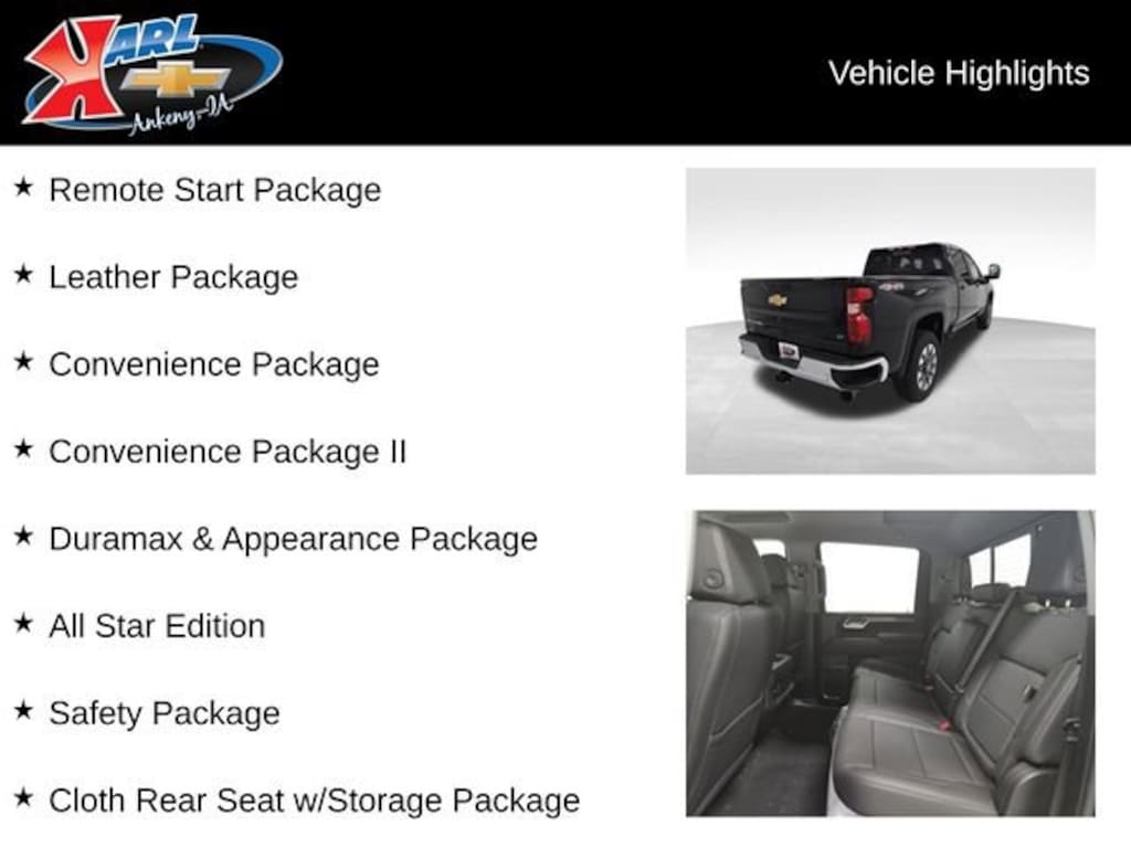 Factory MSRP: $75,634 $6,864 off MSRP! 10-Speed Automatic, 4WD, Black Leather, 10-Way Power Driver Seat Adjuster w/Lumbar, 120-Volt Interior Power Outlet, 2 Charge/Data USB Ports Inside Center Console, 220 Amp Alternator, 3 Years SiriusXM, 4-Way Manual Driver Seat Adjuster, 4 Round Chromed Assist Steps (LPO), 6-Speaker Audio System, Air Conditioning, All Star Edition, AM/FM radio: SiriusXM with 360L, Auto-Dimming Inside Rear-View Mirror, Bed View Camera w/2 Trailer Camera Provisions, Chevrolet Connected Access Capable, Cloth Rear Seat w/Storage Package, Cloth Seat Trim, Color-Keyed Carpeting Floor Covering, Convenience Package, Convenience Package II, Driver door bin, Dual front impact airbags, Dual front side impact airbags, Dual-Zone Automatic Climate Control, Durabed Pickup Bed, Duramax & Appearance Package, Electric Rear-Window Defogger, Electronic Cruise Control w/Set & Resume Speed, Front Chrome Recovery Hooks, Front LED Fog Lamps, Front wheel independent suspension, Halogen Reflector Headlamps, HD Surround Vision, Heat Package, Heated & Auto-Dimming Vertical Trailering Mirrors, Heated door mirrors, Heated Driver & Front Outboard Passenger Seating, Heated Steering Wheel, Hitch Guidance w/Hitch View, Illuminated entry, In-Vehicle Trailering App System, Leather Package, LED Cargo Area Lighting, Manual Tilt & Telescoping Steering Column, Multi-Flex Tailgate, OnStar Services Capable, Outside temperature display, Power door mirrors, Power Front Windows w/Driver Express Up/Down, Power Rear Windows w/Express Down, Power Sliding Rear Window w/Defogger, Power steering, Power windows, Push Button Start, Radio: Chevrolet Infotainment 3 Premium System, Rear 60/40 Folding Bench Seat (Folds Up), Rear Cross Traffic Alert, Remote keyless entry, Remote Start Package, Remote Vehicle Starter System, Safety Package, Snow Plow Prep/Camper Package, Speed control, Standard Tailgate, Steering Wheel Audio Controls, Suspension Package, Trailer Camera Provisions, Trailer Side Blind Zone Alert, Turn signal indicator mirrors, Ultrasonic Front & Rear Park Assist, Unauthorized Entry Theft-Deterrent System, Universal Home Remote, Up-Level Rear Seat w/Storage Package, Wheels: 20 10-Spoke Machined Aluminum, Wireless Charging, Wireless Phone Projection.Black 2025 Chevrolet Silverado 2500HD LT 4D Crew Cab Duramax 6.6L V8 Turbodiesel 10-Speed Automatic 4WD Price includes: $500 - Chevrolet Consumer Cash Program. Exp. 11/03/2025