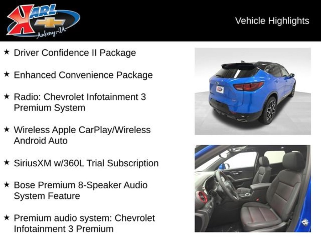 Factory MSRP: $54,315 19/26 City/Highway MPG AWD, 6-Way Power Front Passenger Seat Adjuster, 8-Way Power Driver Seat Adjuster, Adaptive Cruise Control, Air Conditioning, AM/FM radio: SiriusXM with 360L, Auto-dimming Rear-View mirror, Automatic temperature control, Bose Premium 8-Speaker Audio System Feature, Brake assist, Bumpers: body-color, Child-Seat-Sensing Airbag, Compass, Driver Confidence II Package, Driver door bin, Dual front impact airbags, Dual front side impact airbags, Electronic Stability Control, Enhanced Automatic Emergency Braking, Enhanced Convenience Package, Front anti-roll bar, Front Bucket Seats, Front Center Armrest, Front reading lights, Garage door transmitter, HD Surround Vision, Heated door mirrors, Heated front seats, Heated Rear Outboard Seating Positions, Heated steering wheel, Leather Shift Knob, Memory Settings, Occupant sensing airbag, Overhead console, Perforated Leather-Appointed Seat Trim, Power door mirrors, Power Driver Lumbar Control, Power Liftgate, Power Panoramic Tilt-Sliding Sunroof, Power passenger seat, Power steering, Power windows, Premium audio system: Chevrolet Infotainment 3 Premium, Radio: Chevrolet Infotainment 3 Premium System, Rear Camera Mirror, Rear Camera Mirror Washer, Rear window defroster, Rear window wiper, Safety Alert Seat, Speed-sensing steering, Spoiler, Steering wheel mounted audio controls, Telescoping steering wheel, Trip computer, Voltmeter, Wireless Apple CarPlay/Wireless Android Auto.