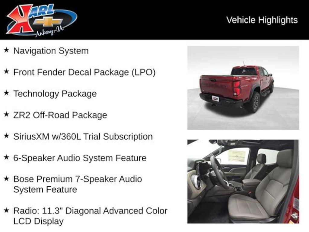Factory MSRP: $56,265 4WD, 4-Way Manual Passenger Seat Adjuster, 6 Speakers, 6-Speaker Audio System Feature, 8-Way Power Driver Seat Adjuster, ABS brakes, Adaptive Cruise Control, Air Conditioning, AM/FM radio: SiriusXM with 360L, Automatic Emergency Braking, Automatic temperature control, Black Nameplates (LPO), Bose Premium 7-Speaker Audio System Feature, Brake assist, Chevy Safety Assist, Driver & Front Passenger Heated Seats, Driver & Front Passenger Ventilated Seats, Driver Memory Settings, Driver vanity mirror, Dual front impact airbags, Dual front side impact airbags, Electronic Stability Control, Emergency communication system: OnStar, Following Distance Indicator, Forward Collision Alert, Front Bucket Seats, Front dual zone A/C, Front Fender Decal Package (LPO), Front Pedestrian & Bicyclist Braking, Front reading lights, Front wheel independent suspension, HD Surround Vision, Heated door mirrors, Heated front seats, Heated steering wheel, IntelliBeam Automatic High Beam On/Off, Lane Keep Assist w/Lane Departure Warning, Memory seat, Navigation System, Occupant sensing airbag, Outside temperature display, Overhead console, Panic alarm, Perforated Leather-Appointed Seat Trim, Power door mirrors, Power Driver Lumbar Control Seat Adjuster, Power Sliding Glass w/Manual Shade Sunroof, Power steering, Power windows, Radio: 11.3 Diagonal Advanced Color LCD Display, Rear Pedestrian Alert, Remote keyless entry, SiriusXM w/360L Trial Subscription, Speed-sensing steering, Split folding rear seat, Steering Wheel Mounted Audio Controls, Technology Package, Wheels: 17 x 8 Graphite & Oxide Gold Aluminum, Wireless Phone Projection, ZR2 Off-Road Package.