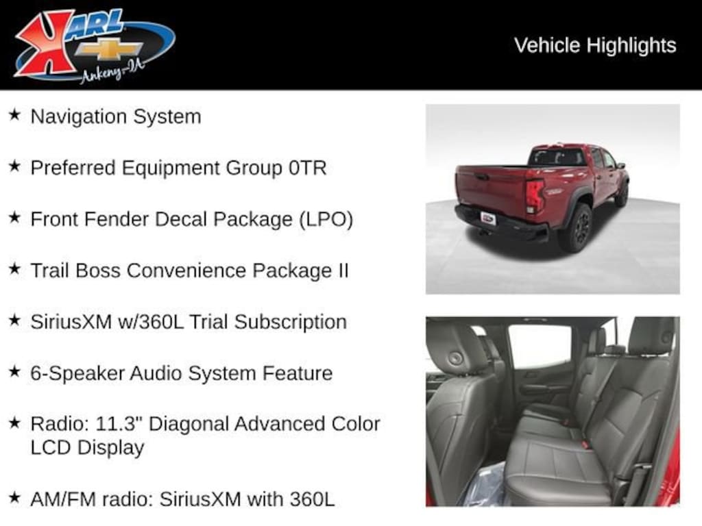 Factory MSRP: $48,340 $3,272 off MSRP! 4WD, 4-Spoke Wrapped Steering Wheel, 6-Speaker Audio System Feature, 8-Way Power Driver Seat Adjuster, Air Conditioning, AM/FM radio: SiriusXM with 360L, Apple CarPlay/Android Auto, Automatic Emergency Braking, Automatic temperature control, Chevy Safety Assist, Cloth Seat Trim, Compass, Driver & Front Passenger Heated Seats, Dual front impact airbags, Dual front side impact airbags, Electronic Stability Control, Evotex Seat Trim, Following Distance Indicator, Forward Collision Alert, Front dual zone A/C, Front Fender Decal Package (LPO), Front Pedestrian & Bicyclist Braking, Heated Steering Wheel, Illuminated entry, IntelliBeam Automatic High Beam On/Off, Lane Keep Assist w/Lane Departure Warning, Low tire pressure warning, Navigation System, Occupant sensing airbag, Off-Road Assist Steps (LPO), Outside temperature display, Overhead console, Power door mirrors, Power Driver Lumbar Control Seat Adjuster, Power windows, Preferred Equipment Group 0TR, Radio: 11.3 Diagonal Advanced Color LCD Display, Rear window defroster, Remote Vehicle Starter System, SiriusXM w/360L Trial Subscription, Speed-sensing steering, Steering Wheel Mounted Audio Controls, Trail Boss Convenience Package II, Wireless Phone Charging, Wireless Phone Projection.