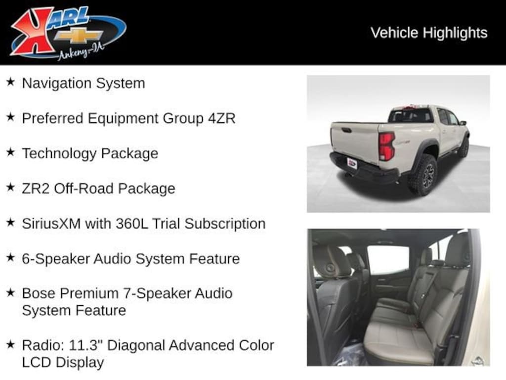 Elevate your off-road adventures with the captivating 2026 Chevrolet Colorado ZR2 In-Transit. This rugged and capable pickup is designed to conquer the most challenging terrains, offering a thrilling driving experience that will leave you eager to explore the great outdoors.- Preferred Equipment Group 4ZR- Technology Package- ZR2 Off-Road Package- Navigation System- Bose Premium 7-Speaker Audio System- Adaptive Cruise Control- Apple CarPlay/Android Auto- Heated and Ventilated Front Seats- Perforated Leather-Appointed Seat TrimPowered by a potent 2.7L I4 Turbocharged engine delivering 310 horsepower, the Colorado ZR2 combines exceptional performance with impressive fuel efficiency, achieving an EPA-estimated 18 MPG in the city and 23 MPG on the highway. The 8-speed automatic transmission and 4-wheel drive system ensure seamless power delivery and exceptional off-road capabilities, making this truck a true force to be reckoned with.The Colorado ZR2's rugged exterior is complemented by a host of advanced features that elevate both the driving experience and your personal comfort. The Chevy Safety Assist suite includes Automatic Emergency Braking, Forward Collision Alert, and Lane Keep Assist, providing you with the peace of mind you deserve. The stunning 11.3-inch diagonal Advanced Color LCD Display offers intuitive navigation and infotainment, while the Bose Premium Audio System delivers a concert-quality listening experience.Step inside the Colorado ZR2 and you'll be greeted by a cabin that combines premium materials, cutting-edge technology, and exceptional craftsmanship. Heated and ventilated front seats, a heated steering wheel, and a Driver Memory Settings feature ensure you and your passengers can travel in absolute comfort, no matter the conditions.At Karl Chevrolet, we are committed to helping you find the perfect vehicle to suit your lifestyle. The 2026 Chevrolet Colorado ZR2 In-Transit is a true off-road champion that blends exceptional capability, advanced technology, and uncompromising style. Experience the thrill of the open road and the untamed wilderness with this remarkable truck. Contact us today to schedule a test drive and discover the true power of the Colorado ZR2.At Karl Chevrolet we want to help you find the best new or used car in Ankeny that suits your needs. When you buy a new car at Karl Chevrolet you know you're finding a vehicle you can rely on. We have a great selection of Platinum Quality Pre-Owned Vehicles. We also pride ourselves in creating a friendly atmosphere and a reliable Dealership that you can trust. Call us and our experts will be glad to help you! (515) 299-4300. *Equipment and options are generated by a 3rd party vendor, exact vehicle options may vary. Please see a salesperson for complete details and vehicle information. Price includes: $500 - Chevrolet Consumer Cash Program. Exp. 03/31/2026