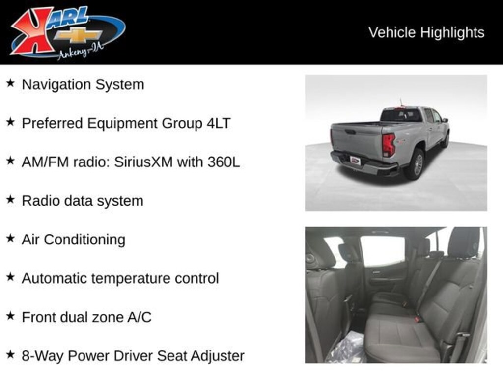 Factory MSRP: $41,395 $2,987 off MSRP! 4WD, 4-Way Manual Passenger Seat Adjuster, 8-Way Power Driver Seat Adjuster, Air Conditioning, AM/FM radio: SiriusXM with 360L, Automatic Emergency Braking, Automatic temperature control, Brake assist, Chevy Safety Assist, Compass, Driver & Front Passenger Heated Seats, Driver door bin, Dual front impact airbags, Dual front side impact airbags, Electronic Stability Control, Following Distance Indicator, Forward Collision Alert, Front Bucket Seats, Front Center Armrest, Front dual zone A/C, Front Pedestrian & Bicyclist Braking, Front reading lights, Heated front seats, IntelliBeam Automatic High Beam On/Off, Lane Keep Assist w/Lane Departure Warning, Low tire pressure warning, Navigation System, Occupant sensing airbag, Overhead console, Passenger vanity mirror, Power steering, Preferred Equipment Group 4LT, Radio data system, Remote keyless entry, Tachometer, Telescoping steering wheel, Tilt steering wheel, Traction control, Wheels: 17 x 8 Argent Metallic Aluminum, Wireless Phone Projection.New Price!Sterling Gray Metallic 2026 Chevrolet Colorado LT 4D Crew Cab 2.7L I4 Turbocharged DOHC 16V LEV3-ULEV50 310hp 8-Speed Automatic 4WD Price includes: $500 - GM Financial Standalone Special APR & Down Payment Assistance Program: $500 discount and 15.90% APR for 36 months. $35.11 per $1000 financed. Available to well qualified buyers who finance through GM Financial. XGU. Exp. 11/03/2025
