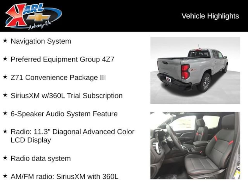 Factory MSRP: $48,465 $3,611 off MSRP! 4WD, 4-Way Manual Passenger Seat Adjuster, 6-Speaker Audio System Feature, 8-Way Power Driver Seat Adjuster, AM/FM radio: SiriusXM with 360L, Automatic Emergency Braking, Automatic temperature control, Brake assist, Chevy Safety Assist, Cloth/Evotex Seat Trim, Driver & Front Passenger Heated Seats, Driver & Front Passenger Ventilated Seats, Driver Memory Settings, Driver Seatback Map Pocket, Dual front impact airbags, Dual front side impact airbags, Electronic Stability Control, Following Distance Indicator, Forward Collision Alert, Front Bucket Seats, Front Center Armrest, Front License Plate Kit, Front Pedestrian & Bicyclist Braking, Front reading lights, Heated door mirrors, Heated Steering Wheel, IntelliBeam Automatic High Beam On/Off, Lane Keep Assist w/Lane Departure Warning, Navigation System, Outside temperature display, Overhead console, Perforated Leather-Appointed Seat Trim, Power driver seat, Power Sliding Glass w/Manual Shade Sunroof, Power steering, Power windows, Preferred Equipment Group 4Z7, Radio data system, Radio: 11.3 Diagonal Advanced Color LCD Display, Rear Center Armrest, SiriusXM w/360L Trial Subscription, Steering Wheel Mounted Audio Controls, Tachometer, Telescoping steering wheel, Wheels: 18 x 8.5 Android Dark Full Gloss Aluminum, Wireless Phone Projection, Z71 Convenience Package III.