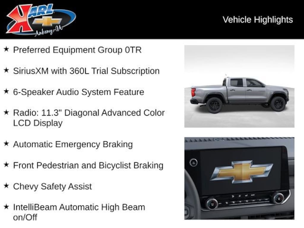 At Karl Chevrolet we want to help you find the best new or used car in Ankeny that suits your needs. When you buy a new car at Karl Chevrolet you know you're finding a vehicle you can rely on. We have a great selection of Platinum Quality Pre-Owned Vehicles. We also pride ourselves in creating a friendly atmosphere and a reliable Dealership that you can trust. Call us and our experts will be glad to help you! (515) 299-4300. *Equipment and options are generated by a 3rd party vendor, exact vehicle options may vary. Please see a salesperson for complete details and vehicle information. Price includes: $500 - Chevrolet Consumer Cash Program. Exp. 04/30/2026