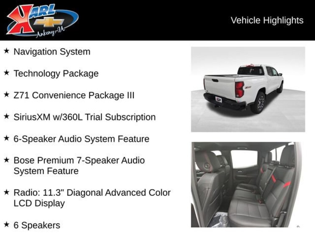 Factory MSRP: $50,164 $3,815 off MSRP! 4WD, 4-Way Manual Passenger Seat Adjuster, 6 Speakers, 6-Speaker Audio System Feature, 8-Way Power Driver Seat Adjuster, Adaptive Cruise Control, Air Conditioning, AM/FM radio: SiriusXM with 360L, Auto High-beam Headlights, Auto-dimming Rear-View mirror, Automatic Emergency Braking, Automatic temperature control, Black Illuminated Front Bowtie Emblem (LPO), Black Nameplates (LPO), Bose Premium 7-Speaker Audio System Feature, Brake assist, Cloth/Evotex Seat Trim, Compass, Driver & Front Passenger Heated Seats, Driver & Front Passenger Ventilated Seats, Driver Memory Settings, Driver Seatback Map Pocket, Driver vanity mirror, Dual front impact airbags, Dual front side impact airbags, Electronic Stability Control, Following Distance Indicator, Forward Collision Alert, Front anti-roll bar, Front Bucket Seats, Front Center Armrest, Front dual zone A/C, Front fog lights, Front Passenger Seatback Map Pocket, Front Pedestrian & Bicyclist Braking, HD Surround Vision, Heated door mirrors, Heated front seats, Heated Steering Wheel, IntelliBeam Automatic High Beam On/Off, Lane Keep Assist w/Lane Departure Warning, Low tire pressure warning, Navigation System, Outside temperature display, Overhead console, Perforated Leather-Appointed Seat Trim, Power door mirrors, Power driver seat, Power steering, Power windows, Radio: 11.3 Diagonal Advanced Color LCD Display, Rear Center Armrest, Rear Pedestrian Alert, Remote keyless entry, SiriusXM w/360L Trial Subscription, Steering Wheel Mounted Audio Controls, Technology Package, Telescoping steering wheel, Trip computer, Wheels: 18 x 8.5 Android Dark Full Gloss Aluminum, Wireless Phone Projection, Z71 Convenience Package III.