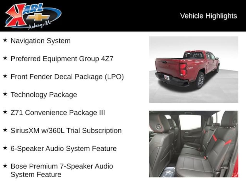 Factory MSRP: $50,609 $3,868 off MSRP! 4WD, 4-Way Manual Passenger Seat Adjuster, 6 Speakers, 6-Speaker Audio System Feature, 8-Way Power Driver Seat Adjuster, Adaptive Cruise Control, Air Conditioning, Auto High-beam Headlights, Automatic Emergency Braking, Automatic temperature control, Bose Premium 7-Speaker Audio System Feature, Brake assist, Chevy Safety Assist, Cloth/Evotex Seat Trim, Delay-off headlights, Driver & Front Passenger Ventilated Seats, Driver Memory Settings, Driver Seatback Map Pocket, Driver vanity mirror, Electronic Stability Control, Following Distance Indicator, Forward Collision Alert, Front Bucket Seats, Front Center Armrest, Front dual zone A/C, Front Fender Decal Package (LPO), Front Passenger Seatback Map Pocket, Front Pedestrian & Bicyclist Braking, Front wheel independent suspension, HD Surround Vision, Heated Steering Wheel, IntelliBeam Automatic High Beam On/Off, Lane Keep Assist w/Lane Departure Warning, Low tire pressure warning, Navigation System, Overhead console, Passenger vanity mirror, Perforated Leather-Appointed Seat Trim, Power steering, Power windows, Preferred Equipment Group 4Z7, Radio: 11.3 Diagonal Advanced Color LCD Display, Rear Center Armrest, Rear Pedestrian Alert, Rear window defroster, Remote keyless entry, SiriusXM w/360L Trial Subscription, Steering Wheel Mounted Audio Controls, Technology Package, Wheels: 18 x 8.5 Android Dark Full Gloss Aluminum, Wireless Phone Projection, Z71 Convenience Package III.