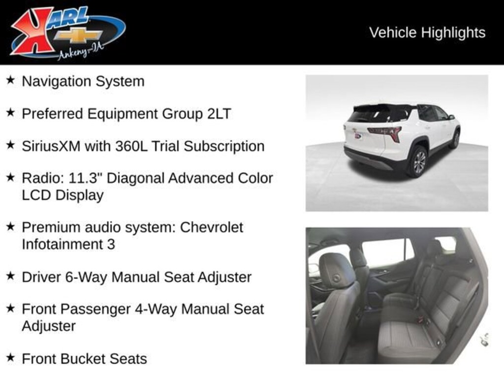 Discover the ultimate in convenience with the Preferred Equipment Group 2LT, which includes a suite of advanced features such as the Navigation System, Premium audio system, and SiriusXM with 360L Trial Subscription. The Equinox LT also boasts a host of safety and driver-assistance technologies, including ABS brakes, Electronic Stability Control, and Occupant Sensing Airbag, ensuring your peace of mind on the road.