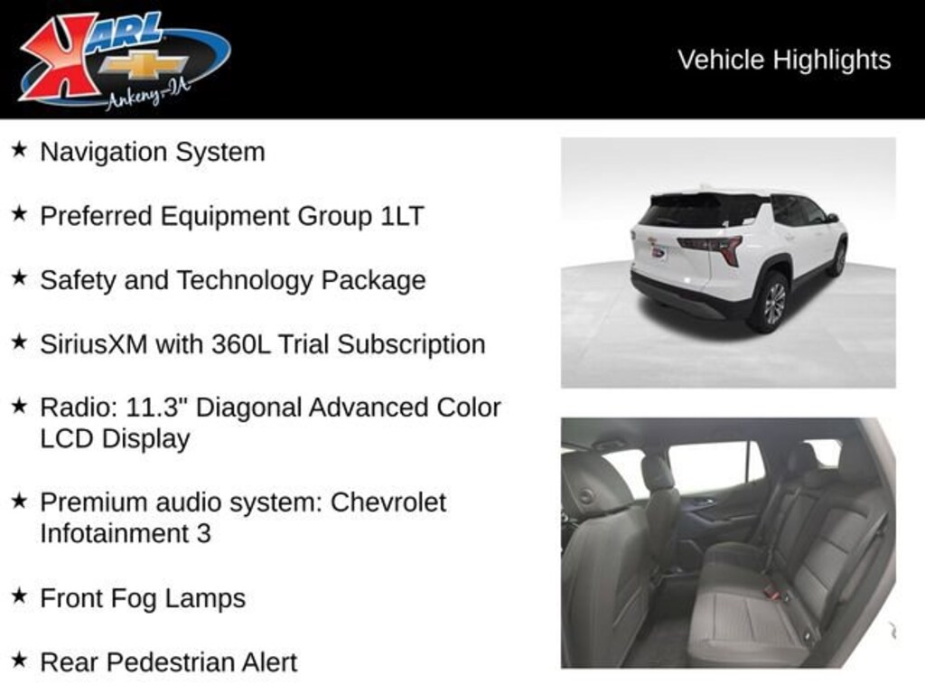 At Karl Chevrolet we want to help you find the best new or used car in Ankeny that suits your needs. When you buy a new car at Karl Chevrolet you know you're finding a vehicle you can rely on. We have a great selection of Platinum Quality Pre-Owned Vehicles. We also pride ourselves in creating a friendly atmosphere and a reliable Dealership that you can trust. Call us and our experts will be glad to help you! (515) 299-4300. *Equipment and options are generated by a 3rd party vendor, exact vehicle options may vary. Please see a salesperson for complete details and vehicle information.