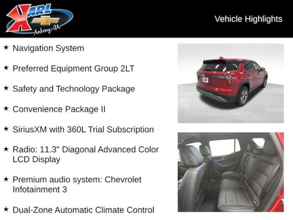 At Karl Chevrolet we want to help you find the best new or used car in Ankeny that suits your needs. When you buy a new car at Karl Chevrolet you know you're finding a vehicle you can rely on. We have a great selection of Platinum Quality Pre-Owned Vehicles. We also pride ourselves in creating a friendly atmosphere and a reliable Dealership that you can trust. Call us and our experts will be glad to help you! (515) 299-4300. *Equipment and options are generated by a 3rd party vendor, exact vehicle options may vary. Please see a salesperson for complete details and vehicle information.