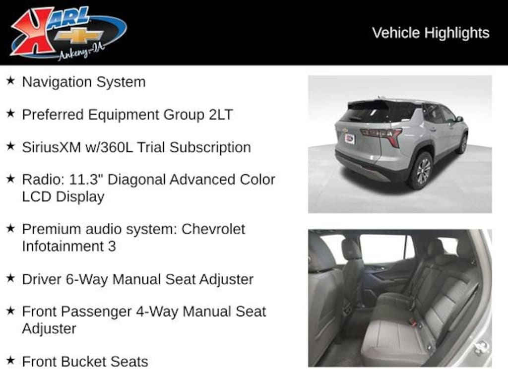 Factory MSRP: $32,495 24/29 City/Highway MPG AWD, Driver 6-Way Manual Seat Adjuster, Front Bucket Seats, Front Center Armrest, Front Passenger 4-Way Manual Seat Adjuster, Heated Driver & Front Passenger Seats, Navigation System, Preferred Equipment Group 2LT, Premium audio system: Chevrolet Infotainment 3, Radio: 11.3 Diagonal Advanced Color LCD Display, SiriusXM w/360L Trial Subscription, Split folding rear seat, Wheels: 17 Grazen Metallic Machined-Face Aluminum.Sterling 2026 Chevrolet Equinox LT 4D Sport Utility 1.5L DOHC 8-Speed Automatic AWD
