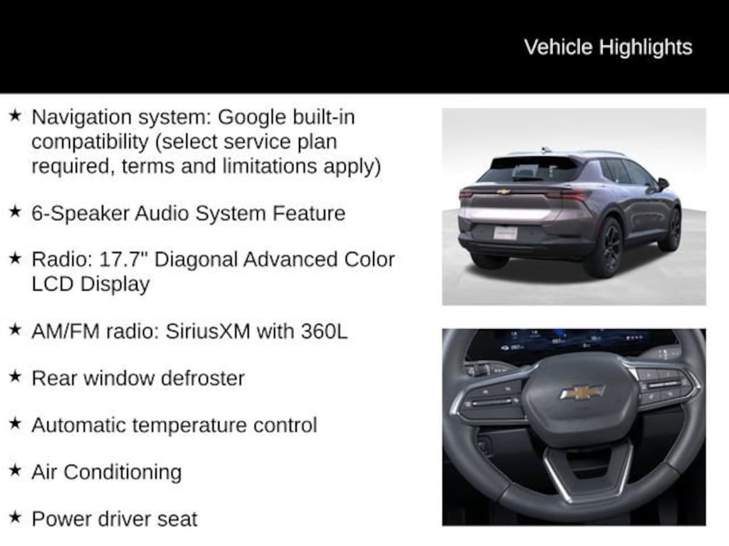 Factory MSRP: $48,095 $9,097 off MSRP! 19 Wheels, 6-Speaker Audio System Feature, Air Conditioning, AM/FM radio: SiriusXM with 360L, Auto-dimming Rear-View mirror, Automatic temperature control, Brake assist, Compass, Delay-off headlights, Driver door bin, Driver vanity mirror, Dual front impact airbags, Dual front side impact airbags, Electric Drive Unit, Electronic Stability Control, Emergency communication system: OnStar and Chevrolet connected services capable, Evotex Seat Trim, Front Bucket Seats, Front Passenger 4-Way Manual Seat Adjuster, Heated door mirrors, Heated front seats, Heated steering wheel, Knee airbag, Navigation system: Google built-in compatibility (select service plan required, terms and limitations apply), Occupant sensing airbag, Outside temperature display, Overhead airbag, Power door mirrors, Power Driver Lumbar Control, Power driver seat, Power Dual Panel Panoramic Sliding Sunroof, Power Liftgate, Power steering, Radio: 17.7 Diagonal Advanced Color LCD Display, Rear reading lights, Rear seat center armrest, Rear window defroster, Rear window wiper, Steering wheel mounted audio controls, Telescoping steering wheel, Variably intermittent wipers.