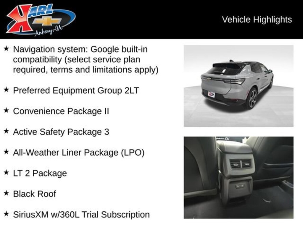 Factory MSRP: $53,940 $5,810 off MSRP! 19 Wheels, 2-Way Front Passenger Power Lumbar, 6-Speaker Audio System Feature, Active Safety Package 3, Black Roof, Convenience Package II, Driver Attention Assist, Driver Memory, Dual-Zone Automatic Climate Control, Enhanced Automatic Parking Assist, Evotex Seat Trim, Front Bucket Seats, Front Center Armrest, Front Passenger 4-Way Manual Seat Adjuster, Front Passenger 6-Way Power Seat Adjuster, Head-Up Display, Heated Rear Outboard Passenger Cushion, Heated Wiper Park, LT 2 Package, Navigation system: Google built-in compatibility (select service plan required, terms and limitations apply), Power Driver Lumbar Control, Power Liftgate, Preferred Equipment Group 2LT, Radio: 17.7 Diagonal Advanced Color LCD Display, Rear Camera Mirror, Rear Camera Mirror Washer, Split folding rear seat, Super Cruise, Universal Home Remote, Uplevel Neutral Density LED Tail Lamps, Wheels: 21 Machined Aluminum.
