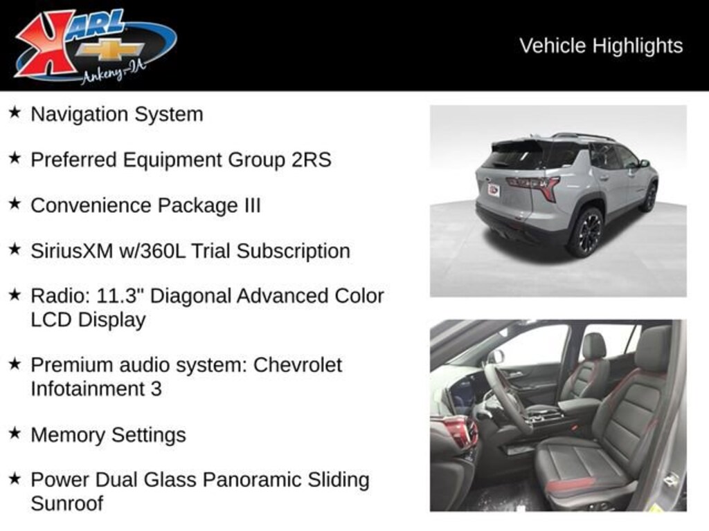 Factory MSRP: $39,840 24/29 City/Highway MPG AWD, 2-Way Power Driver Lumbar Control Seat Adjuster, Convenience Package III, Driver 8-Way Power Seat Adjuster, Evotex Seat Trim, Front Bucket Seats, Front Center Armrest, Front Passenger 2-Way Power Lumbar Seat Adjuster, Front Passenger 4-Way Manual Seat Adjuster, Front Passenger 8-Way Power Seat Adjuster, Heated Driver & Front Passenger Seats, Heated Rear Outboard Seating Positions, Memory Settings, Navigation System, Power Dual Glass Panoramic Sliding Sunroof, Power Liftgate, Preferred Equipment Group 2RS, Premium audio system: Chevrolet Infotainment 3, Radio: 11.3 Diagonal Advanced Color LCD Display, SiriusXM w/360L Trial Subscription, Split folding rear seat, Ventilated Driver Seat, Ventilated Front Passenger Seat, Wheels: 19 Carbon Flash Metallic Aluminum.Recent Arrival!Sterling 2026 Chevrolet Equinox RS 4D Sport Utility 1.5L DOHC 8-Speed Automatic AWD