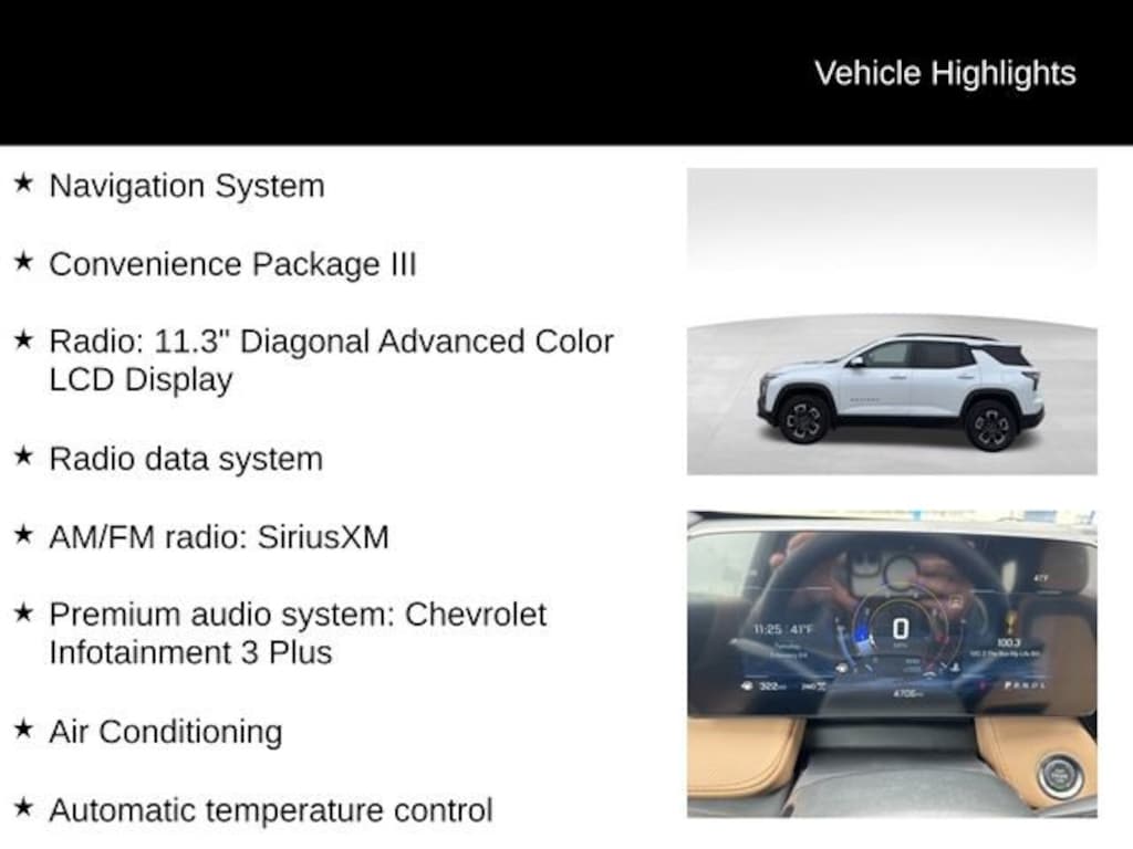 Factory MSRP: $41,446 $741 off MSRP! 2-Way Power Driver Lumbar Control Seat Adjuster, Air Conditioning, AM/FM radio: SiriusXM, Automatic temperature control, Brake assist, Convenience Package III, Driver 8-Way Power Seat Adjuster, Driver door bin, Driver vanity mirror, Dual front impact airbags, Front anti-roll bar, Front Center Armrest, Front dual zone A/C, Front Fog Lamps, Front Passenger 2-Way Power Lumbar Seat Adjuster, Front Passenger 8-Way Power Seat Adjuster, Front reading lights, HD Surround Vision, Heated door mirrors, Heated Rear Outboard Seating Positions, Memory Settings, Navigation System, Outside temperature display, Overhead airbag, Overhead console, Power Liftgate, Power steering, Premium audio system: Chevrolet Infotainment 3 Plus, Radio data system, Radio: 11.3 Diagonal Advanced Color LCD Display, Rain sensing wipers, Rear Camera Mirror Washer, Rear Pedestrian Alert, Rear window wiper, Remote keyless entry, Steering wheel mounted audio controls, Telescoping steering wheel, Tilt steering wheel, Traffic Sign Recognition, Ventilated Driver Seat, Ventilated Front Passenger Seat.