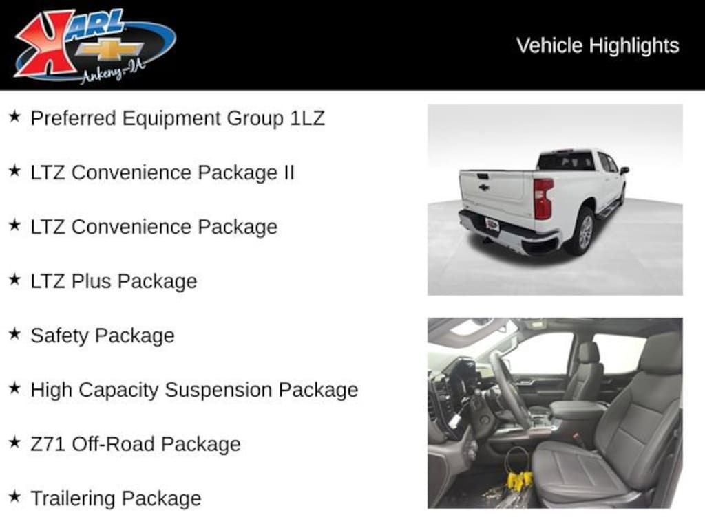 At Karl Chevrolet we want to help you find the best new or used car in Ankeny that suits your needs. When you buy a new car at Karl Chevrolet you know you're finding a vehicle you can rely on. We have a great selection of Platinum Quality Pre-Owned Vehicles. We also pride ourselves in creating a friendly atmosphere and a reliable Dealership that you can trust. Call us and our experts will be glad to help you! (515) 299-4300. *Equipment and options are generated by a 3rd party vendor, exact vehicle options may vary. Please see a salesperson for complete details and vehicle information. Price includes: $1500 - Chevrolet Bonus Cash. Exp. 04/30/2026 $4250 - Chevrolet Consumer Cash Program. Exp. 04/30/2026 Price includes $1,241 dealer added accessories.