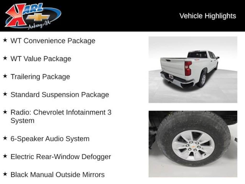 Factory MSRP: $51,890 $732 off MSRP! 10-Speed Automatic, 4WD, Jet Black Vinyl, 3.5 Monochromatic Display Driver Info Center, 40/20/40 Front Split-Bench Seat, 6-Speaker Audio System, Apple CarPlay/Android Auto, Black Manual Outside Mirrors, Deep-Tinted Glass, Electric Rear-Window Defogger, Front Chrome Bumper, Heated Power-Adjustable Outside Mirrors, Hitch Guidance, IntelliBeam Automatic High Beam On/Off, Radio: Chevrolet Infotainment 3 System, Rear 60/40 Folding Bench Seat (Folds Up), Split folding rear seat, Standard Suspension Package, Trailering Package, Vinyl Seat Trim, Wheels: 17 x 8 Bright Silver Painted Aluminum, WT Convenience Package, WT Value Package.