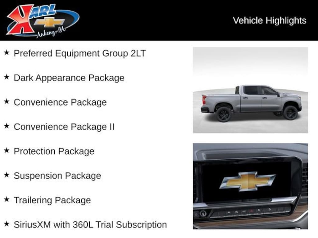At Karl Chevrolet we want to help you find the best new or used car in Ankeny that suits your needs. When you buy a new car at Karl Chevrolet you know you're finding a vehicle you can rely on. We have a great selection of Platinum Quality Pre-Owned Vehicles. We also pride ourselves in creating a friendly atmosphere and a reliable Dealership that you can trust. Call us and our experts will be glad to help you! (515) 299-4300. *Equipment and options are generated by a 3rd party vendor, exact vehicle options may vary. Please see a salesperson for complete details and vehicle information. Price includes: $4250 - Chevrolet Consumer Cash Program. Exp. 04/30/2026 $500 - Chevrolet Bonus Cash. Exp. 04/30/2026