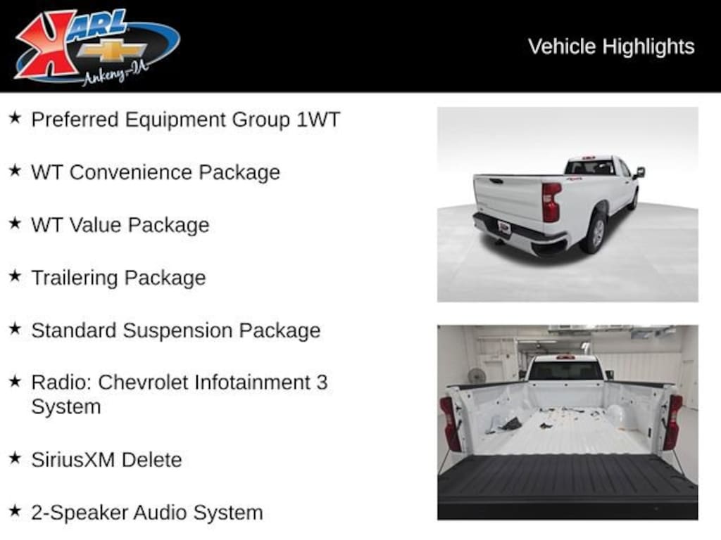 Factory MSRP: $47,895 $5,271 off MSRP! 10-Speed Automatic, 4WD, Jet Black Vinyl, 2-Speaker Audio System, 3.5 Monochromatic Display Driver Info Center, 4-Way Manual Driver Seat Adjuster, 40/20/40 Front Split Bench Seat, Apple CarPlay/Android Auto, Black (Semi-Gloss) Front Bumper, Black (Semi-Gloss) Rear Bumper, Bluetooth® For Phone, Deep-Tinted Glass, Electric Rear-Window Defogger, Electronic Cruise Control, Front Chrome Bumper, Front Frame-Mounted Black Recovery Hooks, Front License Plate Kit, HD Rear Vision Camera, Heated door mirrors, Heated Power-Adjustable Outside Mirrors, Hitch Guidance, Inside Rear-View Mirror w/Tilt, IntelliBeam Automatic High Beam On/Off, Locking Tailgate, Manual Tailgate Function w/No EZ Lift, Manual Tilt Wheel Steering Column, OnStar Services Capable, Power Front Windows w/Driver Express Up/Down, Power Front Windows w/Passenger Express Down, Preferred Equipment Group 1WT, Radio: Chevrolet Infotainment 3 System, Remote Keyless Entry, Rubberized-Vinyl Floor Covering, SiriusXM Delete, Solar Absorbing Tinted Glass, Standard Suspension Package, Standard Tailgate, Teen Driver, Tire Pressure Monitoring System, Trailering Package, Vinyl Seat Trim, Wheels: 17 x 8 Bright Silver Painted Aluminum, Wi-Fi Hot Spot Capable, WT Convenience Package, WT Value Package.